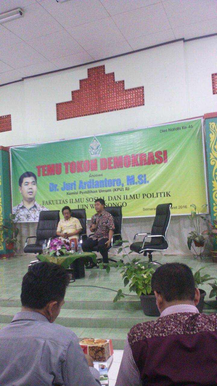 SEMARANG-Komisioner Komisi Pemilihan Umum (KPU) RI, Dr. Juri Ardiantoro, M.Si berharap KPU Kabupaten/Kota sebagai salah satu pelaku demokrasi beserta civitas kampus gotong royong mendorong penguatan demokrasi perpolitikan di Indonesia. “Politik demokrasi masih perlu proses pembelajaran. Transisi politik masih mencari jalannya agar semakin sehat dan dewasa” tegas Juri saat sesi materi Temu Tokoh Demokrasi. Temu Tokoh Demokrasi ini diselenggarakan Fakultas Ilmu Sosial dan Ilmu politik (Fisip) Universitas Islam Negeri (UIN) Walisongo Semarang bekerja sama dengan KPU Jawa Tengah, Kamis (31/3/2016) kemarin. Selain dihadiri seluruh mahasiswa dan dosen Fisip UIN Walisongo, acara ini juga dihadiri KPU Jawa Tengah beserta KPU Kabupaten/Kota se-Jawa Tengah. Indonesia sebagai negara demokrasi terbesar di dunia, lanjut Juri, boleh berbangga karena secara formal kita dapat melaksanakan pemilu dengan baik. Namun tidak cukup begitu karena secara substantif masih banyak hal yang harus diperbaiki. Pilihan demokrasinya juga unik, yaitu demokrasi yang tidak meninggalkan nilai-nilai spiritual, sehingga kesejahteraan masyarakat segera tercapai sesuai dengan tujuan hidup bangsa Indonesia yang multikultural. Dalam acara ini juga sekaligus dilakukan penandatanganan nota kesepahaman atau memorandum of understanding (MoU) antara UIN Walisongo dengan KPU Propinsi Jawa Tengah. Dekan FISIP Dr. Muhyar Fanani, M. Ag menegaskan bahwa hari ini bangsa Indonesia membutuhkan model implementasi unity of science dalam bidang politik. “Arahnya adalah bagaimana politik itu tidak dipisahkan dari nilai-nilai agama agar semua berjalan dengan baik tanpa harus berpecah-belah,” jelas Muhyar . Demokrasi Indonesia, lanjut Muhyar, itu demokrasi pancasila. Yakni demokrasi yg disinari oleh nilai ketuhanan, kejujuran, dan kesucian agar mampu memilih pemimpin yang bijak dan berhikmah. “Bukan demokrasi liberal yang hanya memilih suara terbanyak,” pungkasnya (maks).