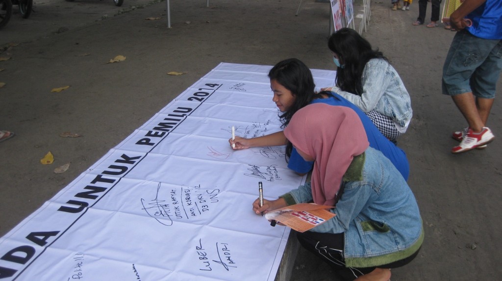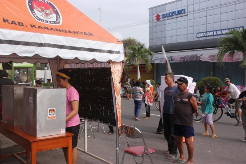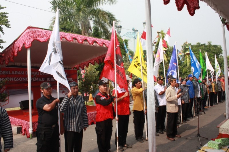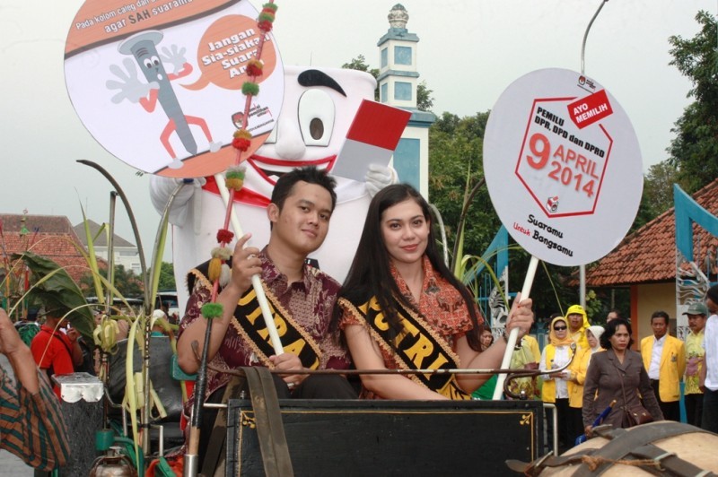 KARANGANYAR (KRjogja.com) – Arak-arakan peserta pemilu menjadi pemandangan menarik warga Bumi Intanpari, Sabtu (15/03/2014) siang. Tak hanya diikuti utusan parpol, kirab Pemilu Damai dimeriahkan parade andong dan kostum tradisional yang dikenakan para pimpinan Muspida dan Putra Putri Lawu. Sebanyak 12 andong masing-masing diisi utusan parpol peserta pemilu yang terdiri ketua, wakil dan sekretaris. Parade andong ini dimeriahkan para simpatisan parpol dengan atribut unik menyesuaikan tema, sedangkan di depan rombongan tampak Bupati Juliyatmono dan Wabub Rohadi Widodo mengenakan pakaian beskap kasatrian dengan menunggang kuda. Terlihat pula Kapolres AKBP Martireni Narmadiana yang juga menaiki kuda bersama kepala daerah, sedangkan pimpinan Satuan Kerja Perangkat Daerah (SKPD) dan elite parpol mengenakan pakaian lurik berikat kepala. Warga Karanganyar bebas menyaksikan pawai ini tanpa perlu khawatir suara bising kendaraan maupun asap dari knalpot, ini karena Kirab Budaya dalam rangka Deklarasi Pemilu Damai, terlarang memakai kendaraan bermotor. “Ide kirab ini dari KPU sendiri. Diharapkan, pola-pola santun semacam ini terus terpelihara,” kata Divisi Sosialisasi KPU Karanganyar, Muhammad Maksum kepada KRjogja.com disela kegiatan, Sabtu (15/03/2014). Hujan deras sempat mengguyur langit Bumi Intanpari di tengah perjalanan kirab. Namun hal ini tidak menyurutkan semangat para peserta untuk menuntaskannya sampai penandatanganan deklarasi Pemilu Damai. Rombongan pawai menempuh rute dari kompleks Sekretariat Daerah sampai Taman Pancasila dan Rumdin Bupati. Sepanjang rute perjalanan, rombongan ini mengusung replika lambang Pancasila yang digotong 5 orang. Sementara itu terkait Deklarasi Pemilu Damai, momentum ini dimulai dengan pembacaan ikrar yang diikuti penandatanganan kesepahaman. Isi deklarasi mencakup lima poin menjaga kondusivitas dan ketertiban lalu lintas.