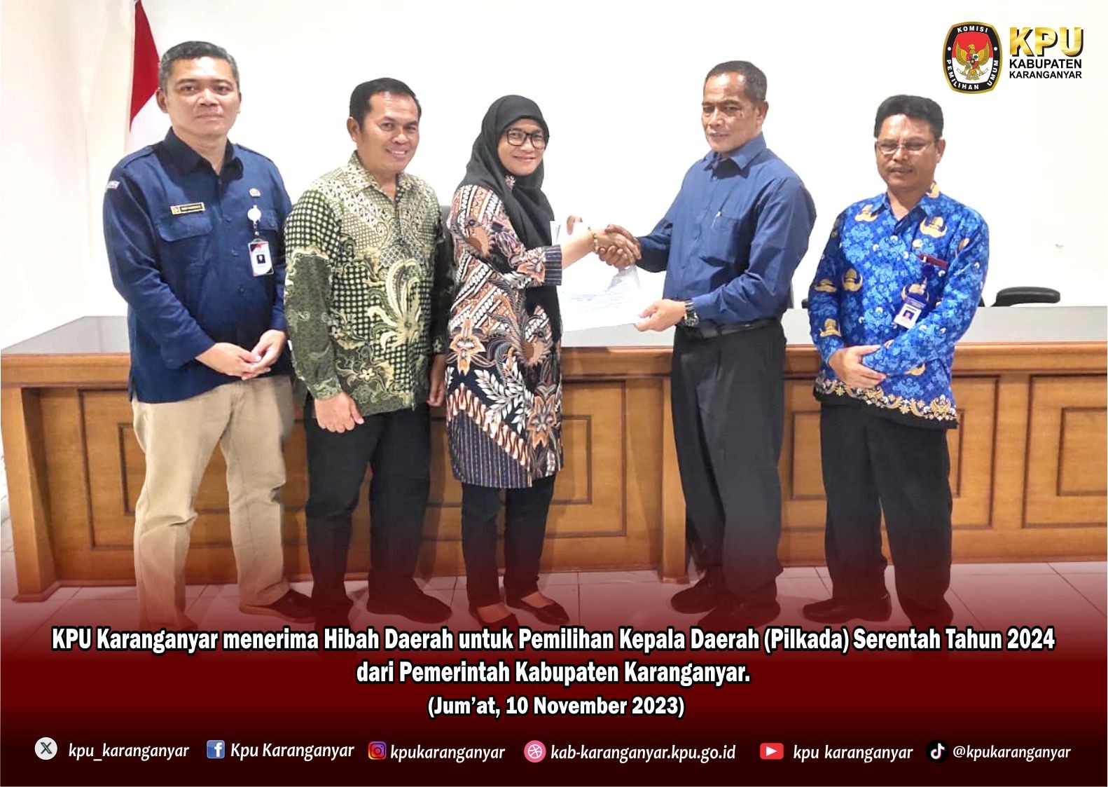KARANGANYAR – KPU Karanganyar menerima Hibah Daerah untuk Pemilihan Kepala Daerah (Pilkada) Serentah Tahun 2024 dari Pemerintah Kabupaten Karanganyar. Naskah Perjanjian Hibah Daerah (NPHD) Pemilihan Bupati dan Wakil Bupati Karanganyar Tahun 2024 disampaikan Pemerintah Kabupaten Karanganyar melalui Kepala Badan Kesbangpol Kabupaten Karanganyar, Bambang Sutarmanto dan diterima langsung oleh Ketua KPU Karanganyar, Triastuti Suryandari, jum'at (10/11/2023).