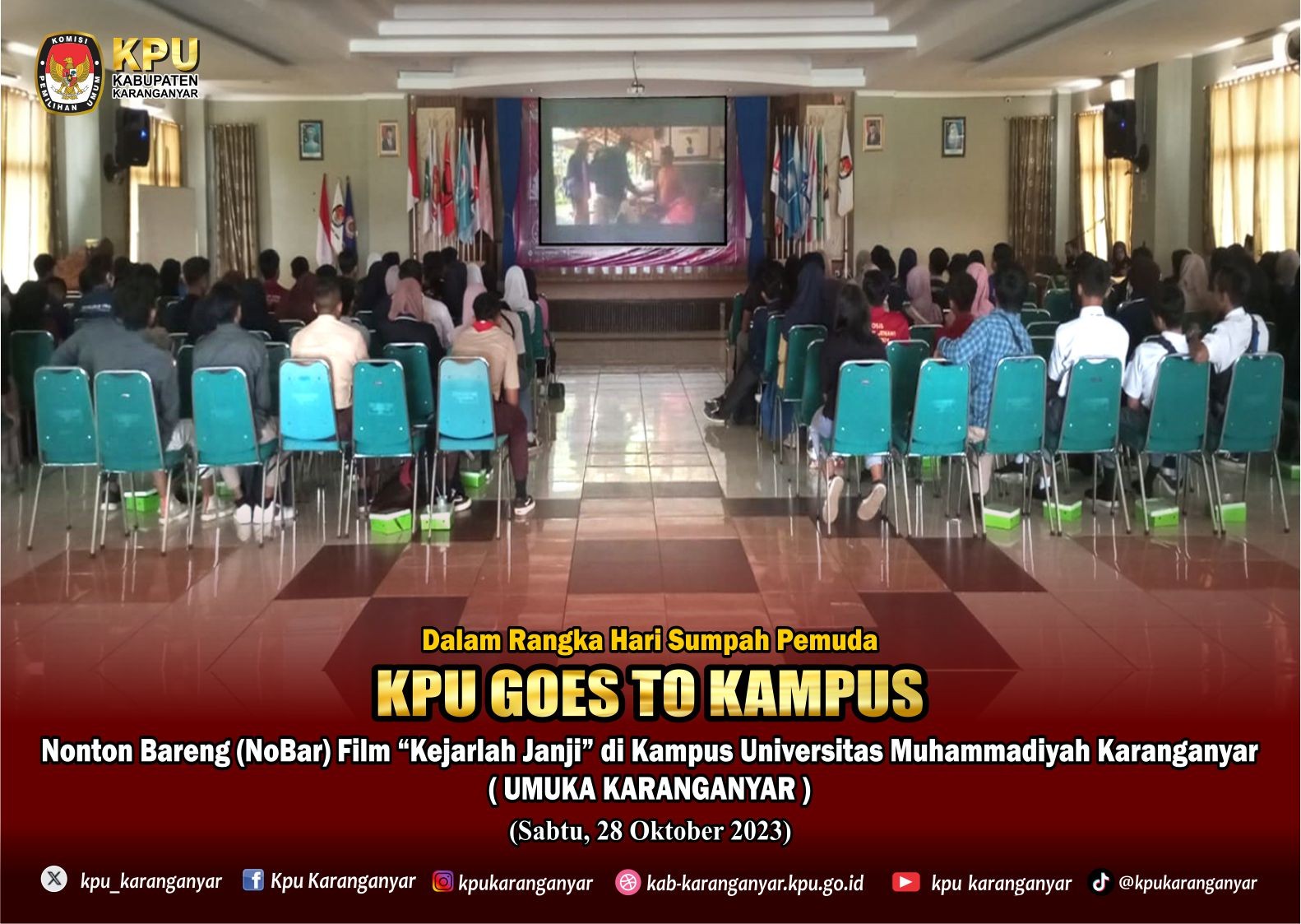 Dalam rangka memperingati Hari Sumpah Pemuda Tahun 2023, KPU Kabupaten Karanganyar menyelenggarakan KPU Goes To Kampus, Nonton Bareng (NoBar) Film "Kejarlah Janji" di Kampus Universitas Muhammadiyah Karanganyar (UMUKA) pada Sabtu (28/10/2023).