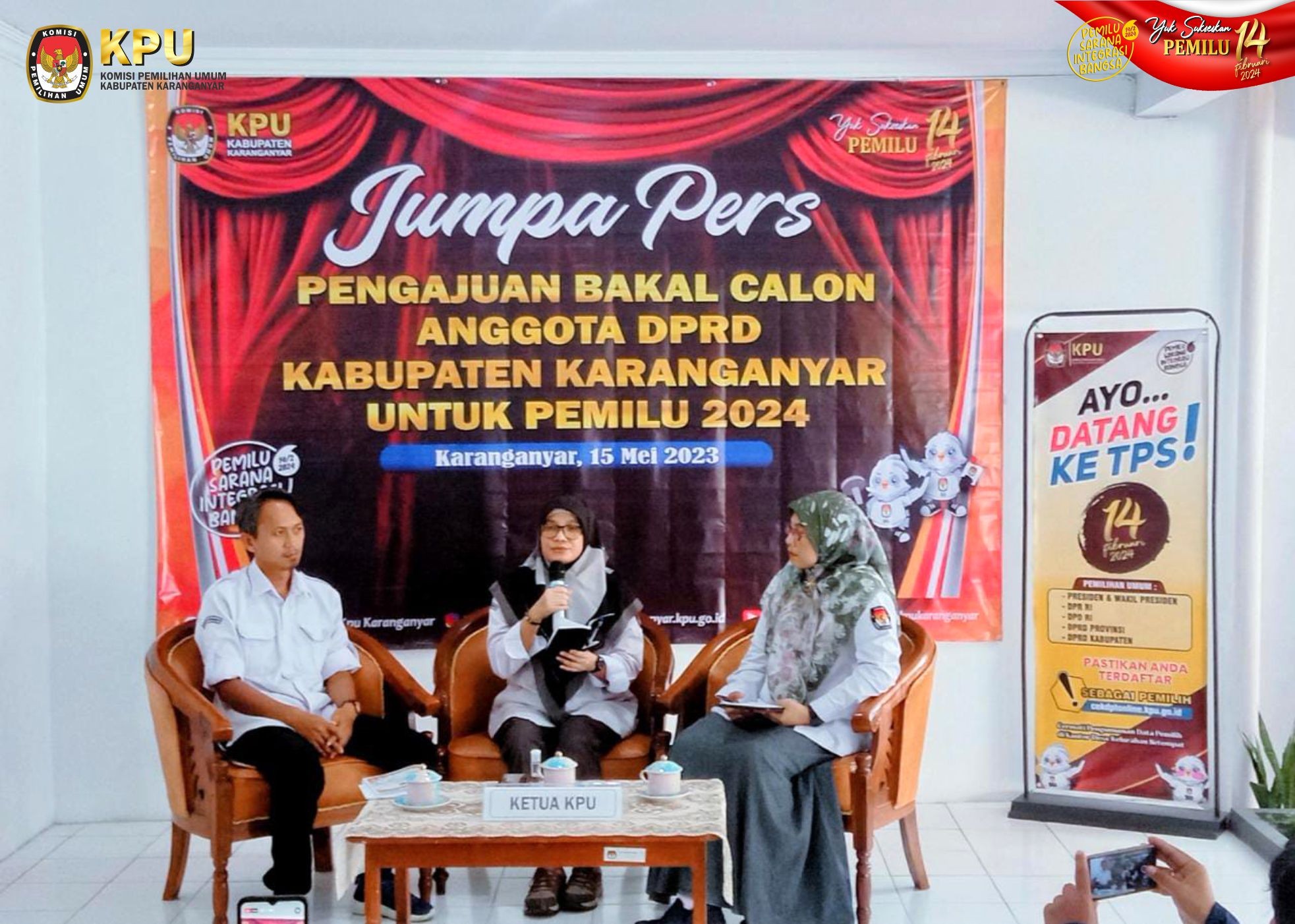 KPU Karanganyar Gelar Jumpa Pers Pengajuan Bakal Calon Anggota DPRD Kabupaten Karanganyar Pemilu 2024, Senin (15/5/2023).