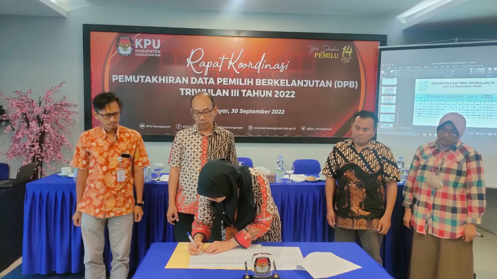 KARANGANYAR - KPU Karanganyar mencatat peningkatan jumlah pemilih dalam Pemutakhiran Daftar Pemilih Berkelanjutan (PDPB) untuk Triwulan III Tahun 2022. Pada periode kali ini untuk bulan Juli, Agustus, dan September 2022, Rakor mencatat peningkatan yang signifikan yaitu bertambahnya pemilih sebanyak 17.875. Dengan rincian pemilih laki-laki sebanyak 339.792 dan pemilih perempuan sebanyak 349.720 serta dengan total sebanyak 689.512 pemilih. Sama halnya dengan Rakor PDPB Triwulanan sebelumnya, Rakor PDPB Triwulan III Tahun 2022 ini juga turut mengundang dinas/instansi terkait, antara lain Disdukcapil Kabupaten Karanganyar, Kepolisian Resort Karanganyar, Kodim 0727 Karanganyar, Pengadilan Negeri Karanganyar, Kementerian Agama Kabupaten Karanganyar, Pangkalan Lanud Adi Soemarmo Karanganyar, Dinas Sosial Kabupaten Karanganyar, Bawaslu Kabupaten Karanganyar, serta ada sedikit yang baru yaitu di Rakor kali ini mengundang Partai Politik Calon Peserta Pemilu 2024 tingkat Kabupaten Karanganyar. Ketua KPU Karanganyar, Triastuti Suryandari, dalam sambutannya menyampaikan bahwa sesuai jadwal dalam Peraturan KPU Nomor 3 Tahun 2022 tentang Tahapan dan Jadwal Penyelenggaraan Pemilihan Umum Tahun 2024 yaitu tahapan Pemutakhiran Data Pemilih dan Daftar Pemilih akan dimulai pada tanggal 14 Oktober 2022. "KPU Karanganyar telah melaksanakan PDPB sejak April 2020 hingga hari ini. Banyak sekali dinamisasi kependudukan yang terjadi di Karanganyar. Mulai dari pindah masuk, pindah keluar, penduduk yang telah berusia 17 tahun, demikian pula yang belum 17 tahun namun sudah menikah, penduduk menjadi TNI/Polri atau purna tugas, ubah data, meninggal dunia, data ganda, tidak padan, padan sama wilayah, serta padan beda wilayah. Dengan banyaknya ketegori ini, KPU Karanganyar akhirnya berhasil menuntaskannya dengan baik", terang Trias. Ketua Divisi Perencanaan, Data, dan Informasi KPU Karanganyar, Kustiyono menyampaikan materi terkait perjalanan DPB sejak awal hingga September 2022. "Bahwasanya selain dasar hukum yang telah menjadi dasar dalam setiap agenda PDPB, di Triwulan III 2022 ini KPU Karanganyar juga melaksanakan perintah SE 17 Tahun 2022 tentang Tindak Lanjut Hasil Pemadanan Data Pemilih Berkelanjutan Semester II Tahun 2022, SE 613 Tahun 2022 tentang DPB Semester II untuk Sinkronisasi Data, dan Surat Ketua KPU No.2331/PL.01-SD/14/2022 tanggal 20 September 2022 perihal Tindak Lanjut Hasil Pemadanan dan Persiapan Penyusunan Data Pemilih Pemilu 2024. Ini dilakukan demi kualitas DPB di Karanganyar lebih baik serta mutakhir", jelas Kustiyono. Sementara itu, Disdukcapil Kabupaten Karanganyar, yang diwakili oleh Kasie Pengelolaan dan Penyajian Data Kependudukan, Yuli Nurwanti menyampaikan bahwa pihaknya terus giat dengan menyisir ke SMA sederajat di Karanganyar agar pada saat tahun 2023 hingga 14 Februari 2024 nanti, penduduk yang telah berusia 17 tahun sudah bisa melakukan perekaman KTP Elektronik dan dapat segera kita cetakkan KTPnya. Selanjutnya, tambah Yuli, terkait dengan penduduk yang tidak memiliki NIK, pihaknya akan memfasilitasinya. "Kita sudah melakukan perekaman, jemput bola kepada saudara-saudara kita yang belum memiliki NIK berdasarkan laporan dari desa/kelurahan. Jadi diharapkan di Karanganyar tidak ada penduduk yang tidak memiliki NIK", terangnya. (HF)