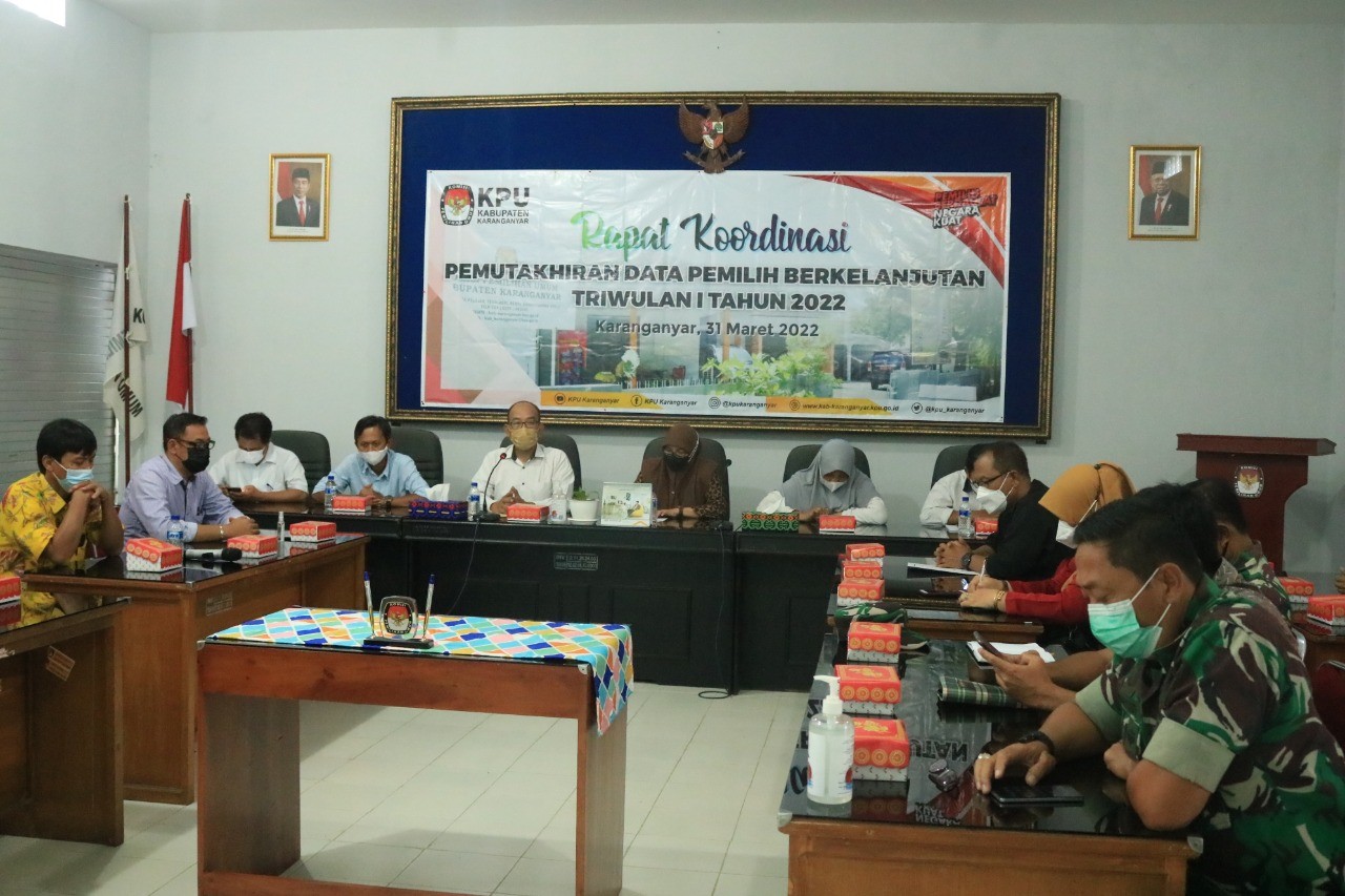 AUDIO BERITA KARANGANYAR - Komisi Pemilihan Umum (KPU) Karanganyar menggelar Rapat Koordinasi Pemutakhiran Data Pemilih Berkelanjutan (PDPB) Triwulan I Tahun 2022, Kamis (31/3/2022). Jumlah pemilih untuk Bulan Maret 2022 sebanyak 675.802 pemilih dengan rincian pemilih laki-laki sebanyak 333.572 dan pemilih perempuan sebanyak 342.230. Jumlah ini meningkat sebanyak 142 pemilih dibandingkan bulan lalu, sebanyak 675.660 pemilih. Rakor Pemutakhiran DPB kali ini, KPU Karanganyar mengundang berbagai pihak terkait antara lain Disdukcapil Kabupaten Karanganyar, Kepolisian Resort Karanganyar, Kodim 0727 Karanganyar, Pengadilan Negeri Karanganyar, Kementerian Agama Kabupaten Karanganyar, Pangkalan Lanud Adi Soemarmo Karanganyar, Dinas Sosial Kabupaten Karanganyar, dan Partai Politik tingkat Kabupaten Karanganyar, serta Bawaslu Kabupaten Karanganyar. Rakor PDPB Triwulan I Tahun 2022 digelar secara luring di kantor KPU Karanganyar, Jalan Tentara Pelajar Tegalasri Bejen Karanganyar, dengan menerapkan protokol kesehatan Covid-19. Ketua KPU Karanganyar, Triastuti Suryandari, dalam sambutannya mengatakan bahwa Rakor ini sebagai ikhtiar KPU dalam melaksanakan PDPB. "Kami terus berkoordinasi dengan berbagai dinas dan instansi di Kabupaten Karanganyar. Untuk bahan olah data DPB bulan ini, kami juga berkoordinasi dengan pemerintah desa sebagai tindaklanjut dari kegiatan Peningkatan Indeks Demokrasi Masyarakat yang diadakan oleh Badan Kesatuan Bangsa dan Politik (Bakesbangpol) Kabupaten Karanganyar bersama dengan KPU Karanganyar November 2021 kemarin," terang Trias. Selain itu, lanjut Trias, KPU Karanganyar juga berkoordinasi dengan Dinas Sosial Kabupaten Karanganyar sebagai upaya kami untuk mendapatkan data penduduk berKTP Karanganyar penyandang disabilitas yang berusia mulai dari 17 tahun. "Harapannya, KPU Karanganyar dapat meningkatkan kualitas data PDPB khususnya disabilitas yang selama ini jarang diperhatikan ketika mengolah data," tambah Trias. Anggota KPU Karanganyar Divisi Perencanaan, Data dan Informasi, Kustiyono mengatakan bahwa KPU Karanganyar akan terus berkoordinasi terkait DPB dan mensosialisasikan aplikasi KPU RI yaitu Lindungihakmu. "Aplikasi Lingdungihakmu dapat diunduh via Play Store di ponsel android. Aplikasi ini dapat digunakan untuk mengecek apakah sudah terdaftar sebagai pemilih atau belum. Apabila belum, masyarakat dapat mengikuti petunjuk cara mendaftar sebagai pemilih di aplikasi tersebut. Selain itu, masyarakat juga dapat mengecek Rekapitulasi Daftar Pemilih Tetap (DPT) hingga tingkat Tempat Pemungutan Suara (TPS)," ujar Kustiyono. Sementara itu, Kepala Bidang Pengelolaan Informasi Kependudukan Disdukcapil Kabupaten Karanganyar, Gunawan, menyampaikan informasi bahwa sudah ada Memorandum of Understanding (MoU) antara Kementerian Agama Kabupaten Karanganyar dengan Disdukcapil Kabupaten Karanganyar. "Ketika Kantor Urusan Agama (KUA) melaporkan daftar penduduk yang berusia di bawah 17 tahun yang sudah menikah ke Disdukcapil, pihak Disdukcapil akan segera membuatkan KTP yang bersangkutan. Kita bertekad untuk melayani data kependudukan semaksimal mungkin begitu ada laporan masuk dari KUA terkait penduduk di bawah 17 tahun yang telah menikah," jelas Gunawan. (HF)