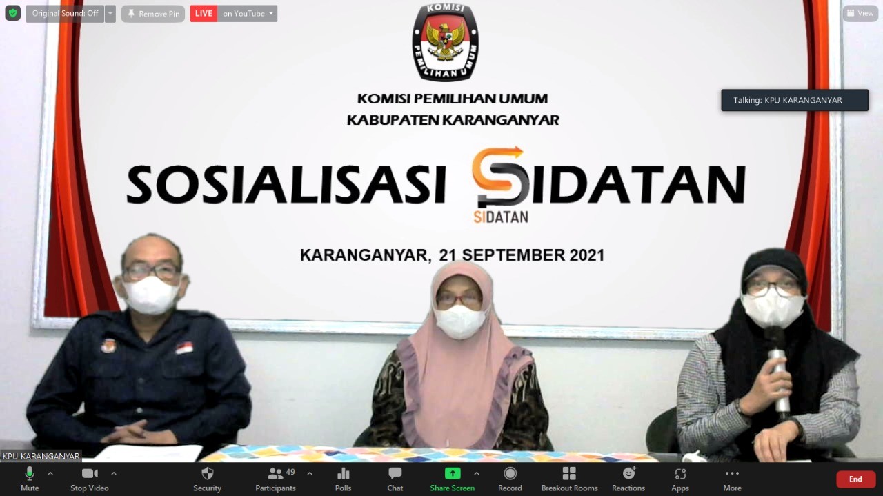 KARANGANYAR – KPU Karanganyar menyelenggarakan sosialisasi Sistem Informasi Data Pemilih Berkelanjutan (SIDATAN) kepada pemilih pemula guna menyongsong pemilihan umum 2024. Hal ini disampaikan Ketua KPU Karanganyar, Triastuti Suryandari dalam membuka kegiatan sosialisasi kepada Pembina OSIS, Pengurus OSIS dan Duta SIDATAN SMA/SMK/MA se Kabupaten Karanganyar, Kamis (21/09/2021). KPU, terang Trias, melaksanakan pendidikan pemilih dengan salah satu sasaran yaitu pemilih pemula khususnya dilingkungan Sekolah SMA/SMA/MA. “Tujuan untuk membangun pengetahuan pemilih, menumbuhkan kesadaran pemilih dan meningkatkan partisipasi pemilih. Selain itu untuk meningkatkan pengetahuan, pemahaman dan kemampuan masyarakat tentang Pemilu maupun Pemilihan,” Ujarnya. Pengukuhan Duta Sidatan merupakan bentuk pendidikan Pemilih yang dilakukan KPU Karanganyar kepada siswa SMA/SMK/MA sederajat sebagai calon pemilih. Duta Sidatan dapat berperan sebagai “influencer” yang mampu mengajak teman-temannya di sekolah. “Duta Sidatan di masing-masing sekolah bisa menyampaikan pentingnya terdaftar sebagai pemilih dalam Pemilu. Serta memberi tutorial pengisian aplikasi Sidatan kepada rekannya yang telah memenuhi syarat sebagai pemilih (sudah berusia 17 tahun). Diharapkan siswa dapat berpartisipasi aktif mendaftarkan dirinya menjadi Pemilih melalui aplikasi Sidatan yang telah dikembangkan oleh KPU Karanganyar,” kata Trias. Sosialisasi Sidatan sebagai upaya KPU dalam mendukung pelaksanaan pendidikan pemilih khususnya pemilih pemula menjadi pemilih yang partisipatif. Kegiatan ini juga mendukung pelaksanaan Pemilihan Ketua OSIS (MILKOI) Serentak 2021 sehingga memacu semangat sekolah-sekolah dalam melaksanakan tahapan demi tahapan yang pada akhirnya tujuan dari pendidikan pemilih pemula dapat terwujud. Anggota KPU Karanganyar Divisi Perencanaan Data dan Informasi, Kustiyono, menyampaikan materi terkait Sosialisasi Sidatan yang bertujuan memperbaharui daftar pemilih guna mempermudah proses pemutakhiran data dan penyusunan daftar pemilih pada pemilu/pemilihan selanjutnya. Dalam paparannya, Kustiyono mengatakan bahwa aplikasi Sidatan adalah Aplikasi berbasis website yang dikembangkan oleh KPU Karanganyar sebagai salah satu ikhtiar untuk memutakhirkan Daftar Pemilih yang menjadi Tugas dan Tanggung Jawab KPU sesuai UU No 7 Tahun 2017. Sedangkan fungsi Aplikasi SIDATAN adalah untuk memfasilitasi Pemilih / Calon Pemilih yang belum terdaftar yang ada di Kabupaten Karanganyar, selain itu dapat pula digunakan oleh Pemilih untuk memperbaiki Data Pemilih,”jelas Kustiyono. Dengan adanya sosialisasi ini, tambah Kustiyono, diharapkan dapat diimplementasikan guna mendukung terlaksananya pendataan pemilih yang baik sehingga terwujud data pemilih yang akurat dan valid. (TR)