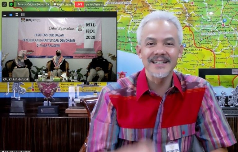 KARANGANYAR – Gubernur Jawa Tengah, Ganjar Pranowo, mengucapkan terima kasih kepada KPU Kabupaten Karanganyar karena telah melaksanakan pendidikan karakter dan demokrasi kepada para pelajar SMA/SMK/MA di Kabupaten Karanganyar. Demikian dikatakan Ganjar yang menjadi keynote speaker pada Diskusi Kepemudaan menyambut peringatan Hari Sumpah Pemuda (HSP) dengan tema Eksistensi OSIS dalam Pendidikan Karakter dan Demokrasi di Masa Pandemi yang diadakan KPU Kabupaten Karanganyar melalui Zoom Meeting, Selasa (27/10/2020). Selain Gubernur Jawa Tengah, Diskusi Kepemudaan menghadirkan juga narasumber Ketua KPU Provinsi Jawa Tengah, Yulianto Sudrajat dan Koordinator Pengawas Dinas Pendidikan Wilayah 6 Disdikbud Jawa Tengah, Esti Murwanto. Diskusi Kepemudaan juga dimanfaatkan KPU Karanganyar untuk mengumumkan pemenang Apresiasi Lomba Milkoi (Milih Ketua OSIS SMA/SMK/MA) se-Kabupaten Karanganyar yang dilaksanakan pada 9 September 2020. Didepan peserta yang terdiri dari Pembina OSIS, Ketua dan Pengurus OSIS SMA/SMK/MA se Kabupaten Karanganyar, Gubernur Jateng menyampaikan Pendidikan Demokrasi dan Karakter. “Yang dibutuhkan adalah partisipasi. Karena kalau tidak ada partisipasi, siapa yang mau peduli,” ujar Ganjar. Dengan partisipasi, lanjut Ganjar, demokrasi menjadi bermakna. Sehingga akan muncul solusi terhadap permasalahan yang terjadi. Wujud partisipasi merupakan bentuk kepedulian melalui gotong royong untuk kepentingan bersama. “Dengan pendidikan demokrasi yang dilakukan KPU Kabupaten Karanganyar, diharapkan para pelajar bisa berpartisipasi untuk bangsa dan negara dengan kemampuan yang bagus,” harap Ganjar. Ketua KPU Kabupaten Karanganyar, Triastuti Suryandari, menyatakan bahwa KPU Karanganyar mempunyai tanggungjawab terhadap Pendidikan Pemilih dan Demokrasi yang diwujudkan dengan merintis pendidikan demokrasi kepada pelajar sejak tahun 2016. “KPU bekerjasama dengan Dinas Pendidikan Wilayah VI Jawa Tengah dan Kementerian Agama Kabupaten Karanganyar serta SMA/SMK/MA se-Kabupaten Karanganyar untuk melakukan pembinaan siswa,” kata Trias. Untuk mendukung pembinaan siswa, tambah Triastuti, KPU Kabupaten Karanganyar menfasilitasi Sekolah SMA/SMK/MA dengan memberikan pembelajaran demokrasi dan pendidikan politik kepada siswa. Dimulai sejak 2016, KPU Kabupaten Karanganyar mengadakan Pemilihan OSIS Serentak yang bertema Milkoi Gaya Serentak (Milih Ketua OSIS Gaya Serentak-red),” jelas Trias. Pelaksanaan Milkoi 2020 telah usai, Pemimpin OSIS sudah terpilih, maka langkah selanjutnya adalah unjuk kerja agar eksistensi OSIS selalu terjaga. Walaupun saat sekarang ini masih dalam masa pandemi, harapannya hal tersebut bukan menjadi penghalang ataupun penghambat, justru menjadi pemacu semangat dalam berkreasi, melakukan inovasi untuk memajukan organisasi ,” ucap Triastuti. (*1)