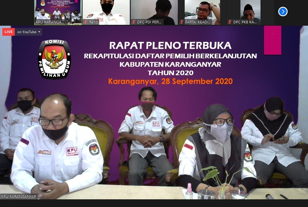 KARANGANYAR – KPU Kabupaten Karanganyar menetapkan daftar pemilih berkelanjutan (DPB) sebanyak 690.881 pemilih dalam Rapat Pleno Terbuka Daftar Pemilih Berkelanjutan yang digelar secara daring (dalam jaringan-red), Senin (28/09/2020). Rapat pleno dilaksanakan melalui aplikasi zoom meeting yang melibatkan Polres Karanganyar, Kodim 0727 Karanganyar, Dinas Kependudukan dan Catatan Sipil Kabupaten Karanganyar, Badan Pengawas Pemilu Kabupaten Karanganyar dan Partai Politik tingkat Kabupaten Karanganyar. Ketua KPU Kabupaten Karanganyar, Triastuti Suryandari membacakan Berita Acara Rekapitulasi PDPB bulan September 2020. “Dari jumlah pemilih Daftar Pemilih Tetap Hasil Pemutakhiran Ketiga (DPTHP-3) sebanyak 695.027, terdapat potensi pemilih baru sebanyak 46. Sementara potensi pemilih yang Tidak Memenuhi Syarat (TMS) sebanyak 1.343 orang. Jadi, rekapitulasi pemilih berkelanjutan sampai dengan Septmeber 2020 ditetapkan sebanyak 690.881 orang, terdiri dari 341.382 laki-laki dan 349.499 perempuan,” Katanya. Untuk mendukung suksesnya Pemutakhiran Daftar Pemilih Berkelanjutan, lanjut Trias, KPU Karanganyar membuka layanan publik untuk pemilih melakukan pemutakhiran data pemilih di kantor KPU Karanganyar melalui tanggapan dan masukan masyarakat dengan cara datang langsung ke Kantor KPU Karanganyar atau mengunjungi laman resmi KPU Karanganyar. “Peran serta masyarakat khususnya di Kabupaten Karanganyar sangat kami butuhkan dalam pelaksanaan Pemutakhiran Data Pemilih Berkelanjutan dengan mewujudkan pemilih yang partisipatif,” imbuhnya. “Berdasarkan ketentuan Surat Edaran Ketua KPU RI No. 181/PL.02.1-SD/01/KPU/II/2020 tentang Pemutakhiran Data Pemilih Berkelanjutan Tahun 2020. “Bahwa KPU Kabupaten/Kota melakukan koordinasi secara berkala dengan perwakilan Partai Politik, dan instansi atau lembaga terkait untuk menyampaikan kegiatan Pemutakhiran Data Pemilih Berkelanjutan dan mendapatkan data yang berkaitan dengan kegiatan Pemutakhiran Data Pemilih Berkelanjutan. Menindaklanjuti ketentuan Surat Edaran KPU tersebut KPU Karanganyar telah berkoordinasi dengan instansi/lembaga terkait meliputi Dinas Kependudukan dan Catatan Sipil, Polres Karangayar dan Kodim 0727 Karanganyar untuk memperoleh data sebagai bahan pencermatan dalam Pemutakhiran Data Pemilih Berkelanjutan. Kegiatan Pemutakhiran Data Pemilih Berkelanjutan akan kami laksanakan secara berkala di bulan bulan berikutnya sebagai ikhtiar kami untuk memperoleh tanggapan dan masukan yang nantinya dijadikan tambahan bahan pelaksanaan Pemutakhiran Data Pemilih. Dengan dukungan unsur masyarakat Kabupaten Karanganyar, akan terwujud data pemilih yang berkualitas sebagai acuan dalam pelaksanaan Pemilu atau Pemilihan yang akan datang lebih baik lagi.(TR)