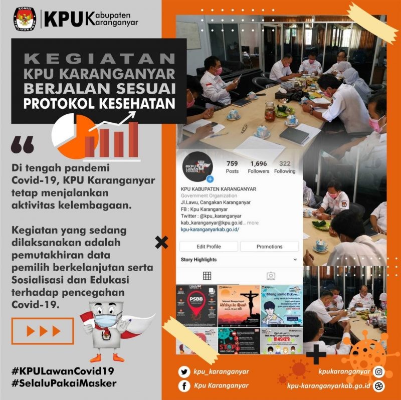 Sosialisasi dan Edukasi diperlukan agar masyarakat lebih memahami bahayanya Covid-19, sehingga sadar untuk melakukan pencegahan terhadap penyebarannya. ” KPU Karanganyar mengoptimalkan laman website dan media informasi yang dimiliki untuk melakukan sosialisasi dan edukasi. Media Sosial berupa facebook, Instagram, youtube, Twitter dan yang lainnya digunakan untuk pencegahan penyebaran corona, Jelas Devid.