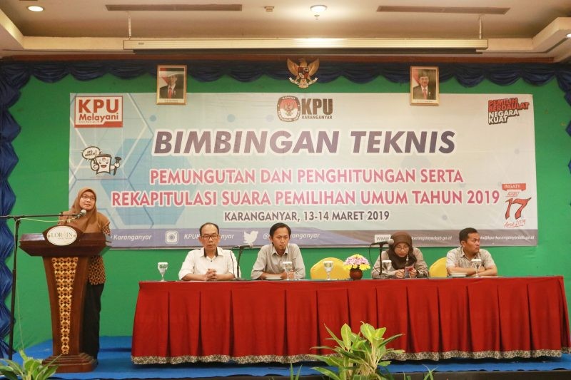 Karanganyar, 13-14 Maret 2019 – Komisi Pemilihan Umum Kabupaten Karanganyar selenggarakan Bimbingan Teknis (Bimtek) Pemungutan dan Penghitungan serta Rekapitulasi Suara Pemilu tahun 2019 kepada Panitia Pemilihan Kecamatan (PPK) se Kabupaten Karanganyar. Bimtek kali ini digelar di Hotel Lor In, Karanganyar. Ketua KPU Kabupaten Karanganyar, Triastuti Suryandari, dalam sambutannya mengatakan bahwa dalam Bimtek kali ini diharapkan PPK memahami alur dari pemungutan dan penghitungan serta rekapitulasi suara. Titik tumpunya adalah di Kelompok Penyelenggara Pemungutan Suara (KPPS) sebagai penyelenggara harus paham mengenai tugas-tugas KPPS. Oleh karena itu, PPK diharuskan paham karena akan memberikan Bimtek pada jajaran di bawahnya sampai dengan tingkat TPS. PPK se Kabupaten Karanganyar yakni 17 kecamatan sebagai peserta dibagi menjadi tiga kelas. Tiap kelas diampu oleh pemateri yakni komisioner KPU Kabupaten Karanganyar. Dalam tiap kelas terdapat materi Bimtek berupa pemungutan suara, penghitungan suara, serta rekapitulasi dan keuangan. Ketika BIMTEK di tiap kelas, selain komisioner memberikan materi, tiap tiap kelompok kecamatan diharuskan merangkai puzzle berdasarkan materi yang diberikan. Diharapkan dengan merangkai puzzle materi, PPK beserta sekretariatnya memahami materi yang diberikan. Dalam kegiatan yang dilaksanakan dua hari tersebut, selain KPU Kabupaten Karanganyar, juga ada Bawaslu Kabupaten Karanganyar yang memberikan materi terkait pengawasan Tungsura Pemilu tahun 2019 dan Polres Karanganyar juga memberikan materi mengenai pengamanan Tungsura Pemilu tahun 2019. Kegiatan ditutup pukul 11.30 WIB setelah diadakan Post Test mengenai pengisian formulir C1.