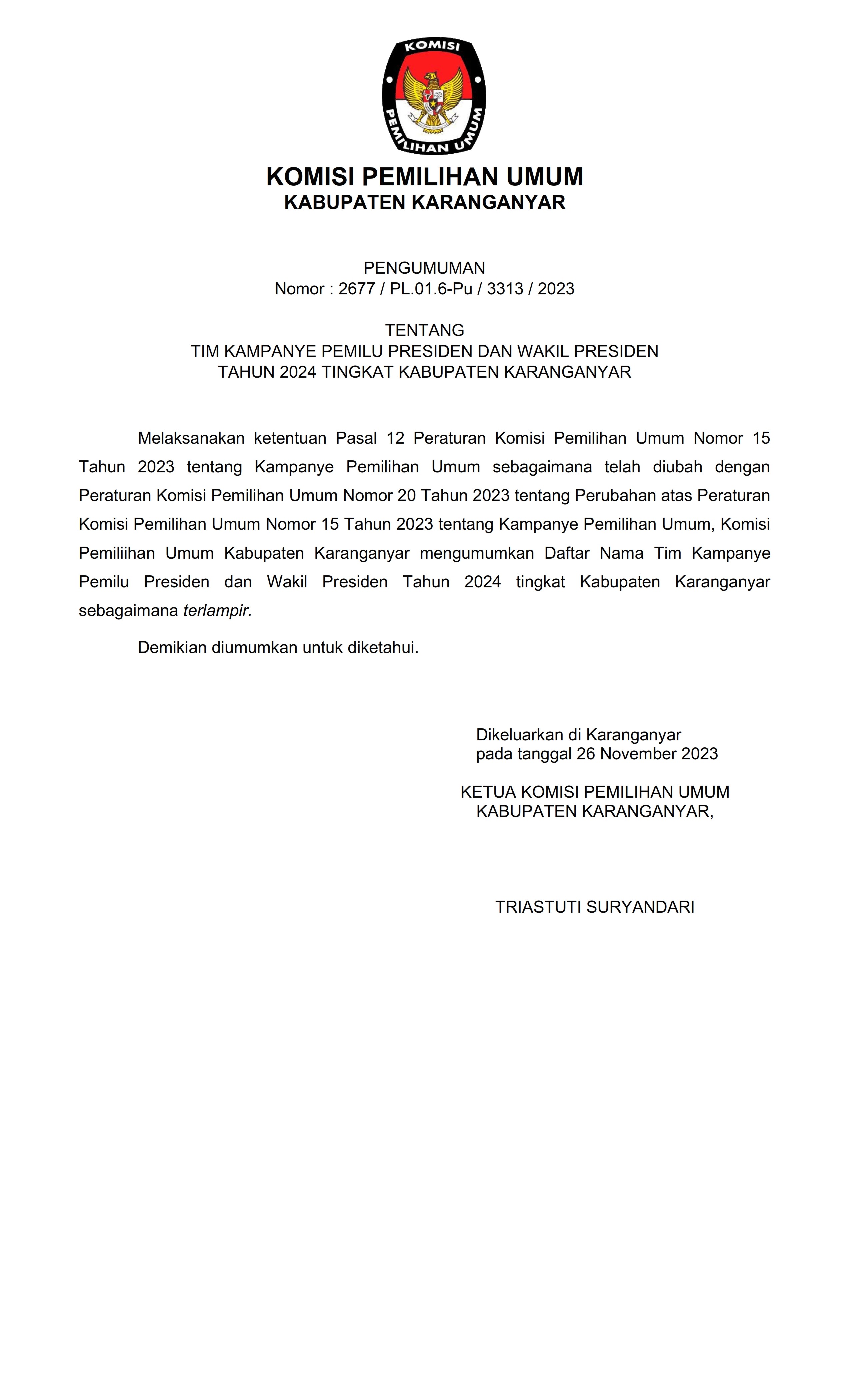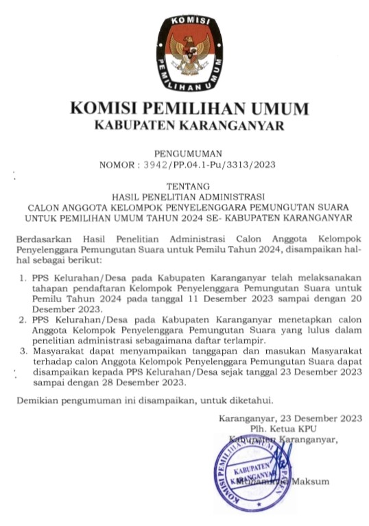 Pengumuman Nomor 3942/PP.04.1-PU/3313/2023 tentang Hasil Penelitian Administrasi Calon Anggota Kelompok Penyelenggara Pemungutan Suara (KPPS) untuk Pemilihan Umum Tahun 2024 Se-Kabupaten Karanganyar