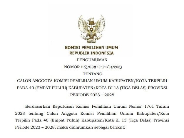 Jakarta, kpu.go.id - Pengumuman Nomor 1163/SDM.12-Pu/04/2023 tentang Calon Anggota Komisi Pemilihan Umum Kabupaten/Kota Terpilih pada 40 (Empat Puluh) Kabupaten/Kota di 13 (Tiga Belas) Provinsi Periode 2023-2028.