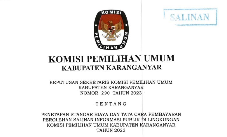 KEPUTUSAN KPU KARANGANYAR TENTANG PENETAPAN STANDAR BIAYA DAN TATA CARA PEMBAYARAN PEROLEHAN SALINAN INFORMASI PUBLIK Jumat, 12 Mei 2023 20:00 49 DOWNLOAD KEPUTUSAN Baca Selengkapnya