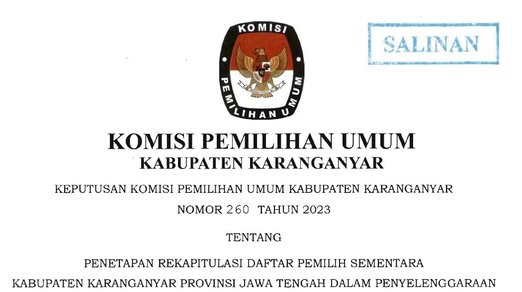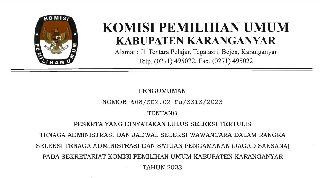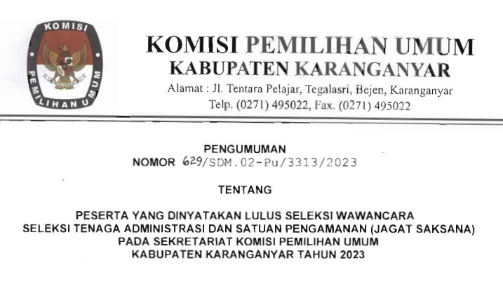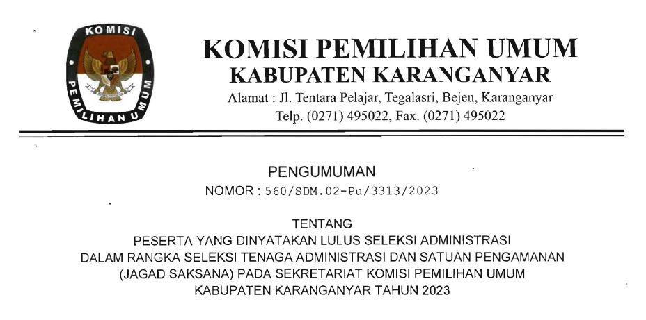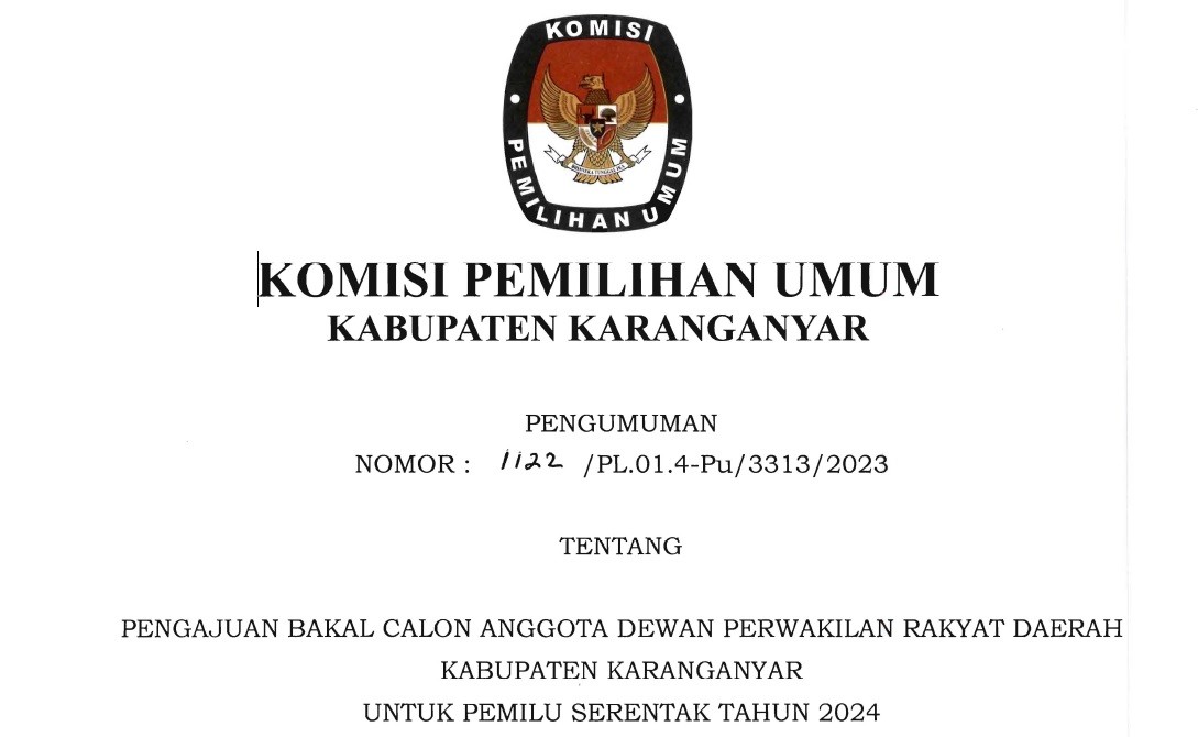 Pengumuman No.1122/PL.01.4-Pu/3313/2023 tentang Pengajuan Bakal Calon Anggota DPRD Kabupaten Karanganyar untuk Pemilu Serentak Tahun 2024.