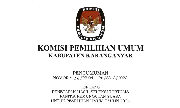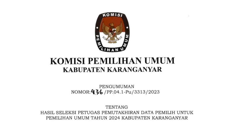 PENGUMUMAN HASIL SELEKSI PANTARLIH UNTUK PEMILU TAHUN 2024 KABUPATEN KARANGANYAR Minggu, 12 Februari 2023 15:12 236 DOWNLOAD PENGUMUMAN Baca Selengkapnya