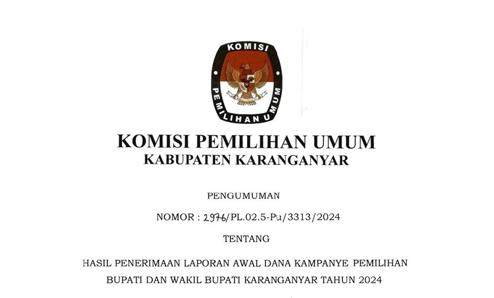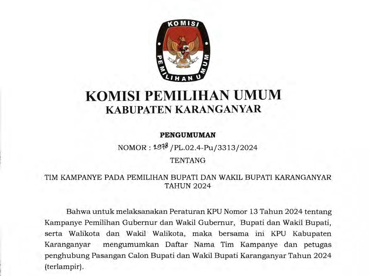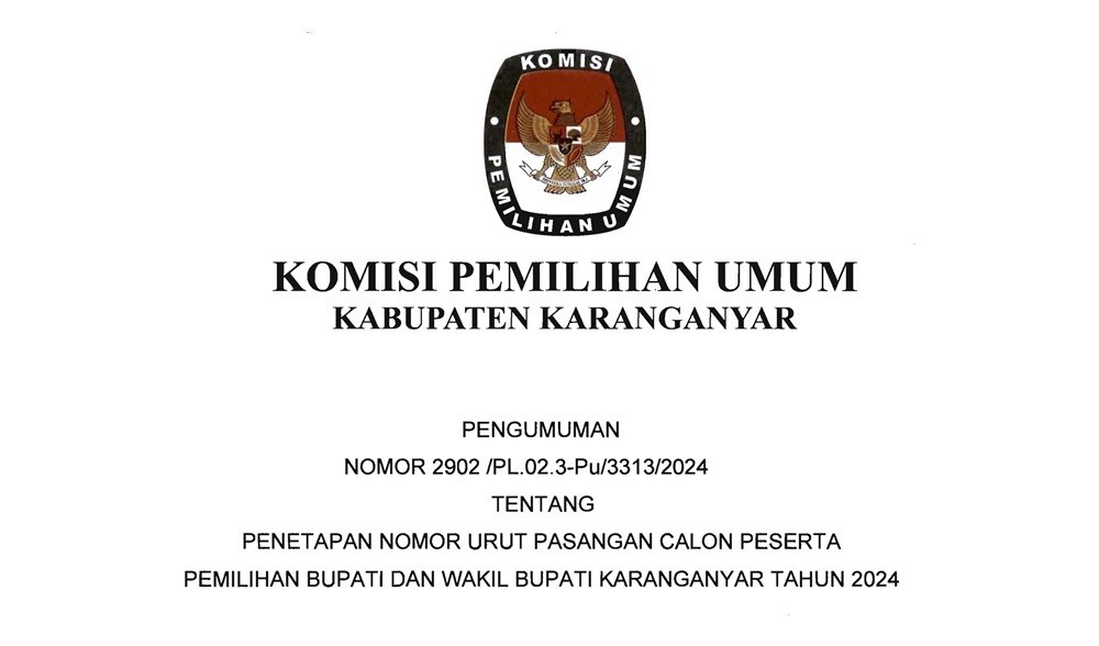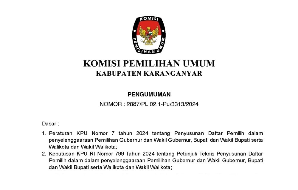 Berikut pengumuman Daftar Pemilih Tetap Pemilihan Gubernur dan Wakil Gubernur Jawa Tengah serta Bupati dan Wakil Bupati Karanganyar Tahun 2024