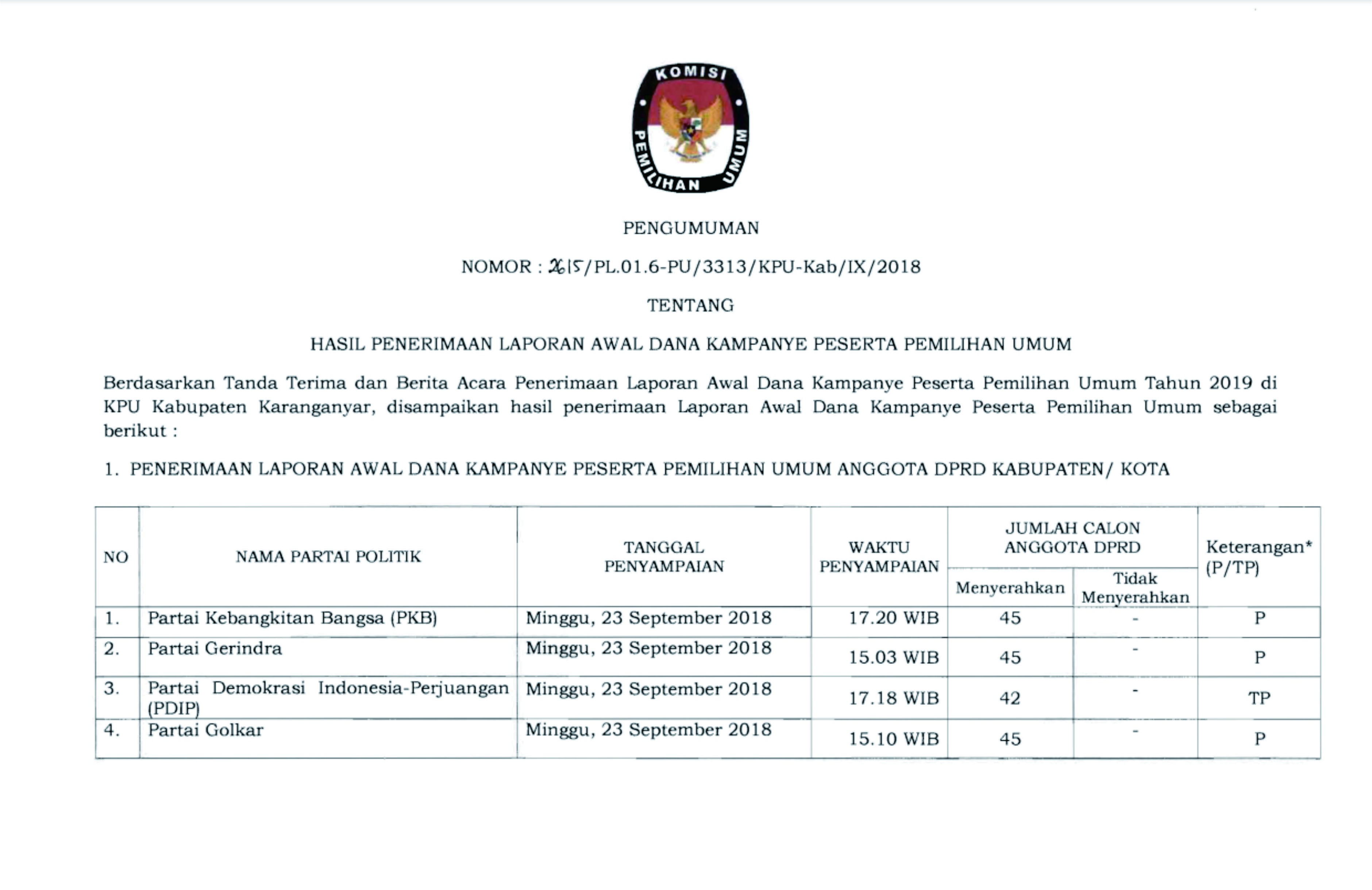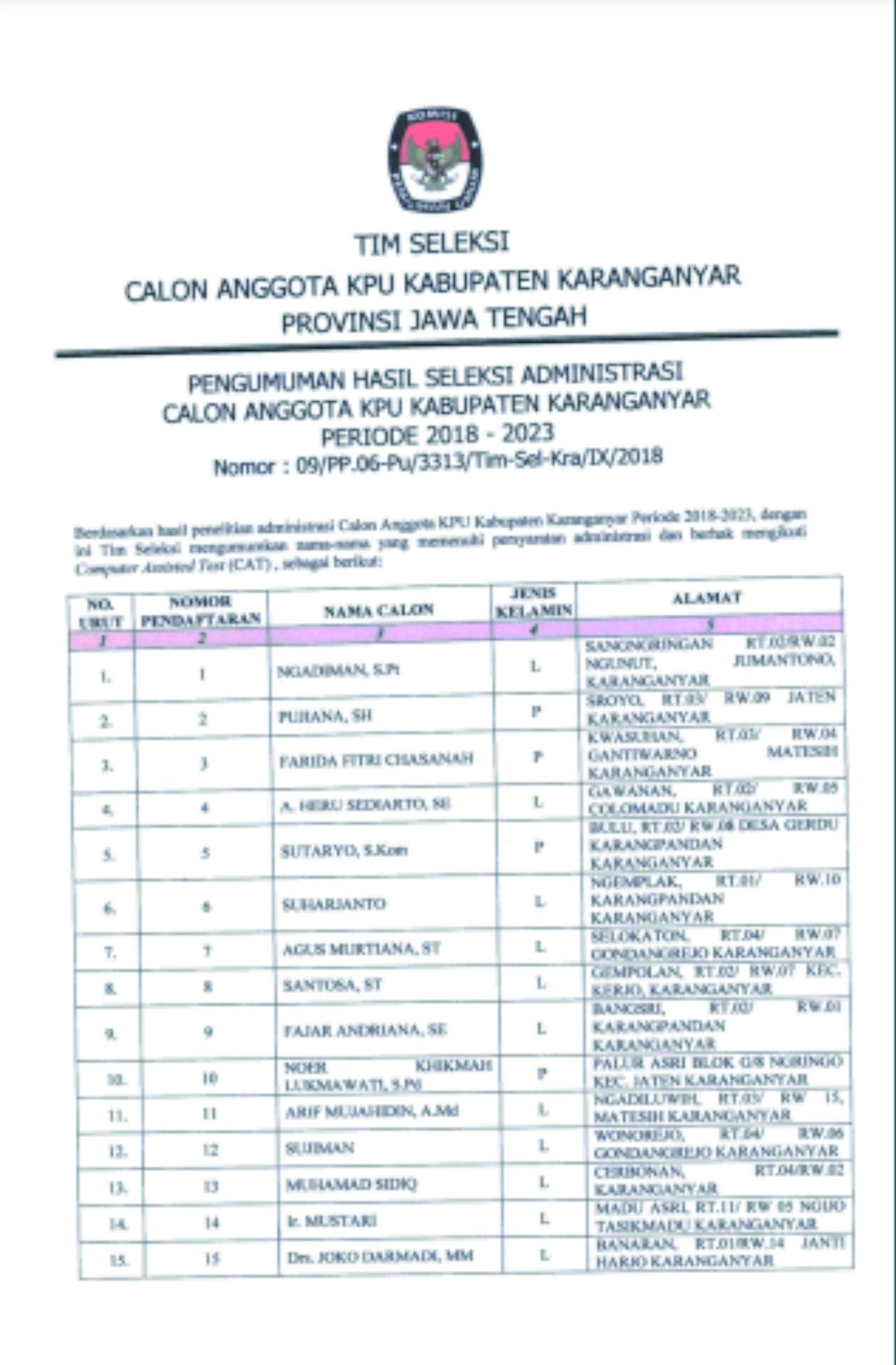 PENGUMUMAN HASIL SELEKSI ADMINISTRASI CALON ANGGOTA KPU KABUPATEN KARANGANYAR PERIODE 2018 – 2023 Kamis, 04 Oktober 2018 00:00 38 DOWNLOAD Baca Selengkapnya
