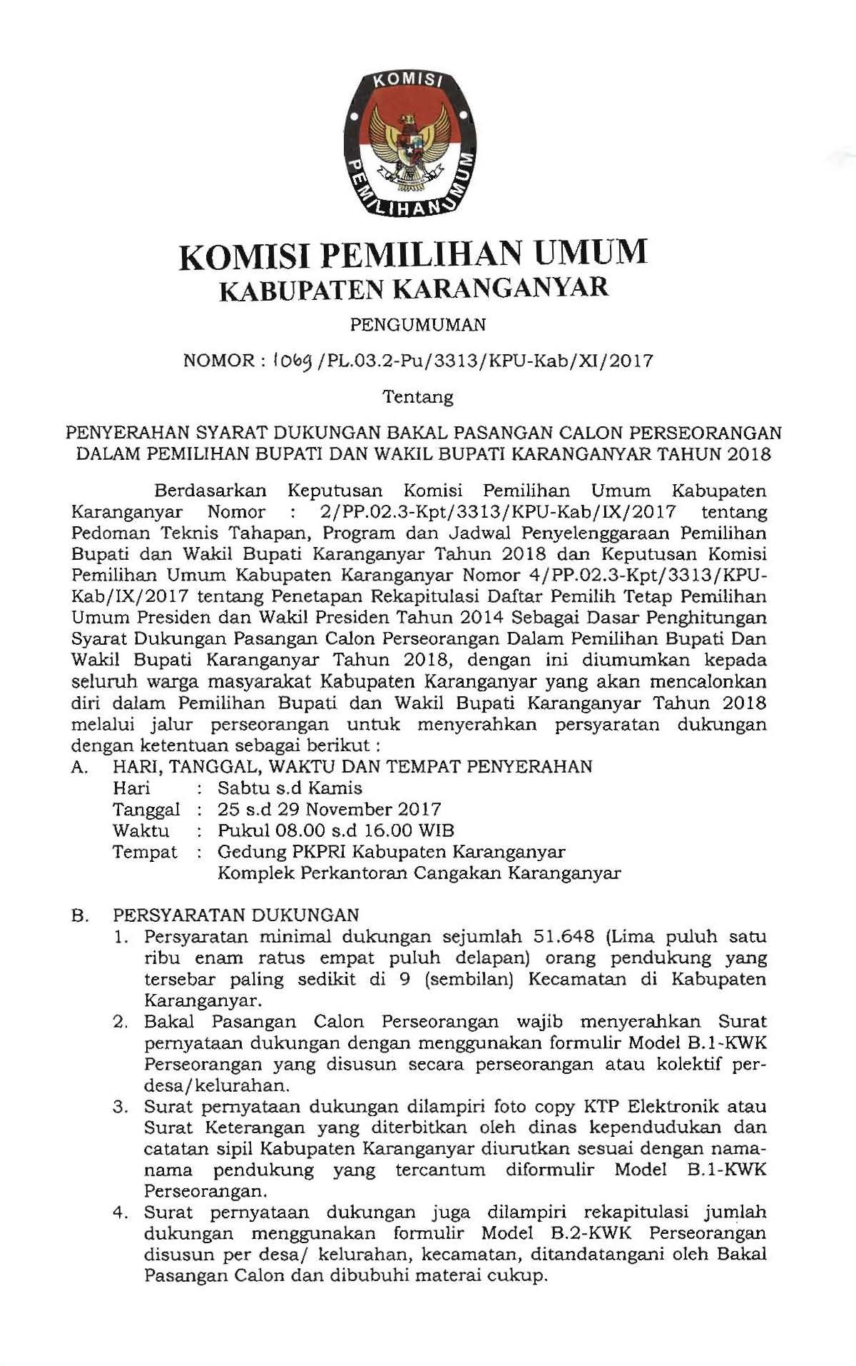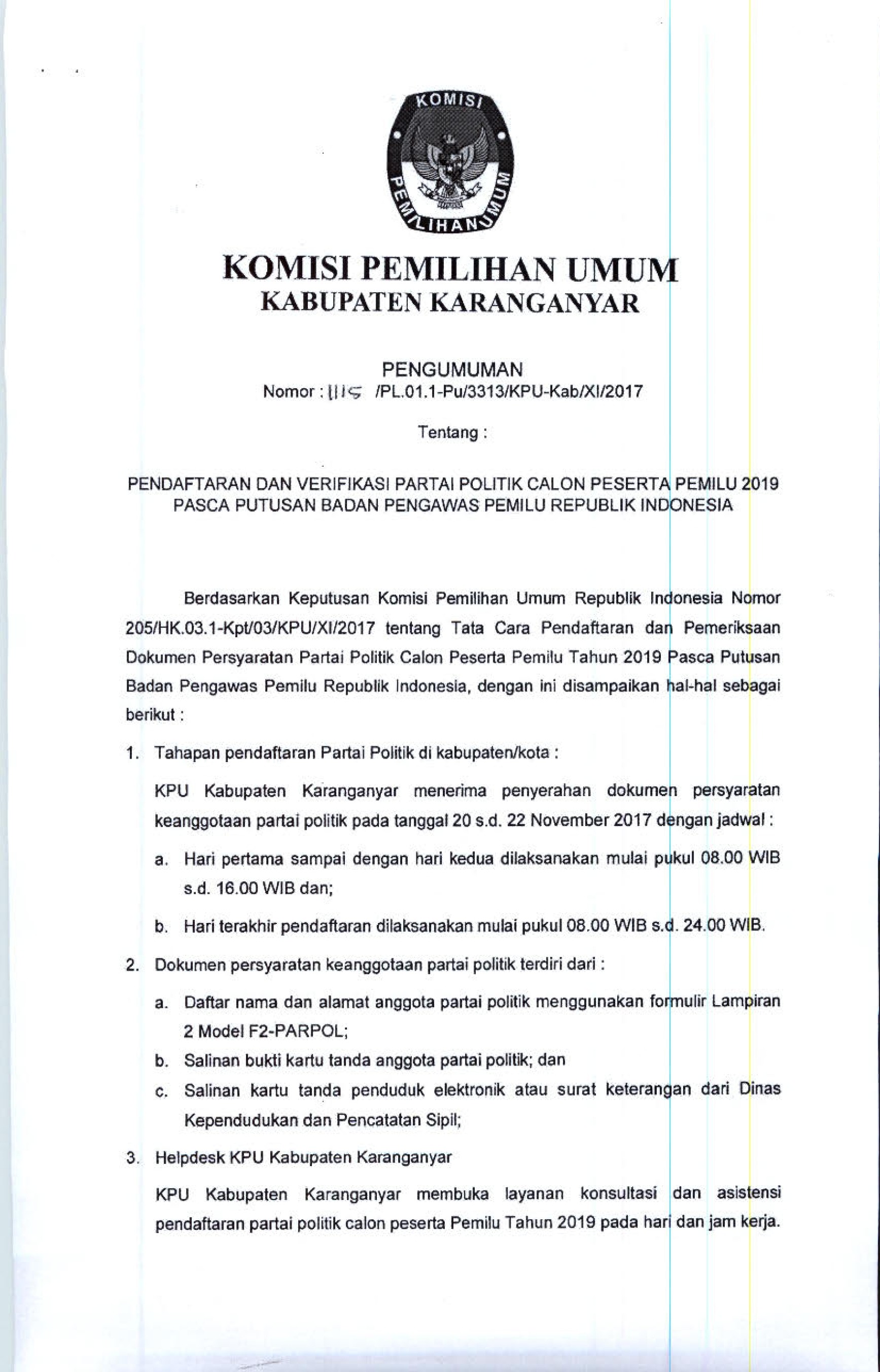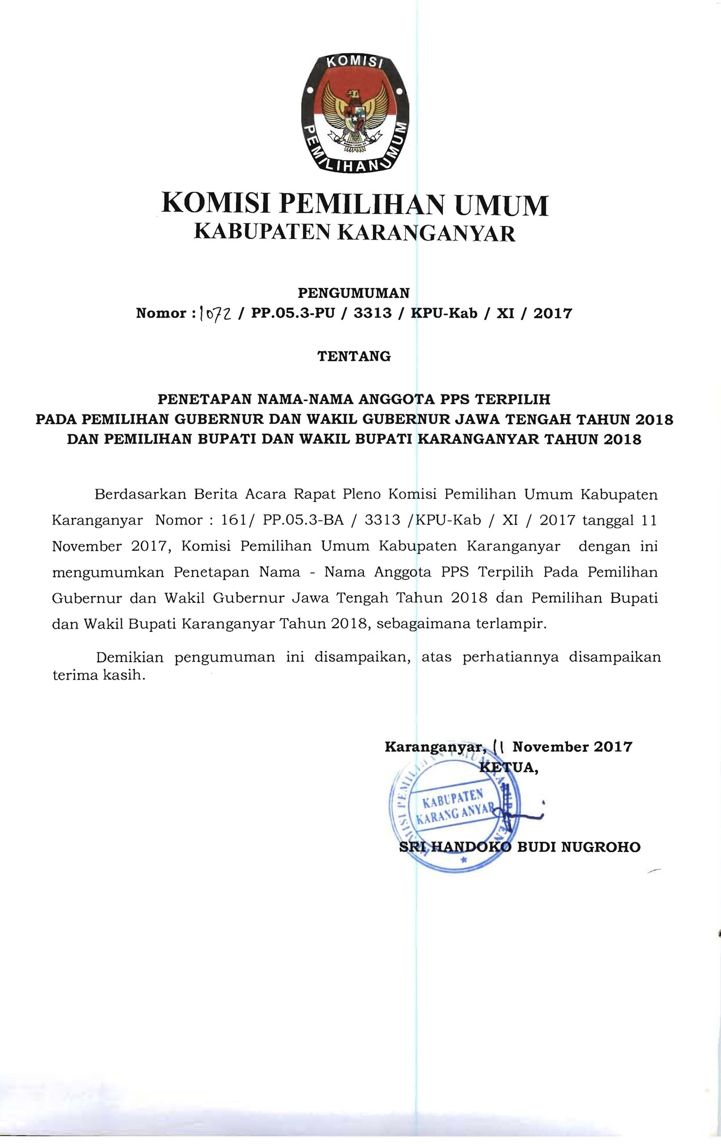 (DOWNLOAD) PENGUMUMAN NOMOR 1072/PP.05.3-PU/3313/KPU-Kab/XI/2017 TENTANG PENETAPAN NAMA-NAMA ANGGOTA PPS TERPILIH PADA PEMILIHAN GUBERNUR DAN WAKIL GUBERNUR JAWA TENGAH TAHUN 2018 DAN PEMILIHAN BUPATI DAN WAKIL BUPATI KARANGANYAR TAHUN 2018