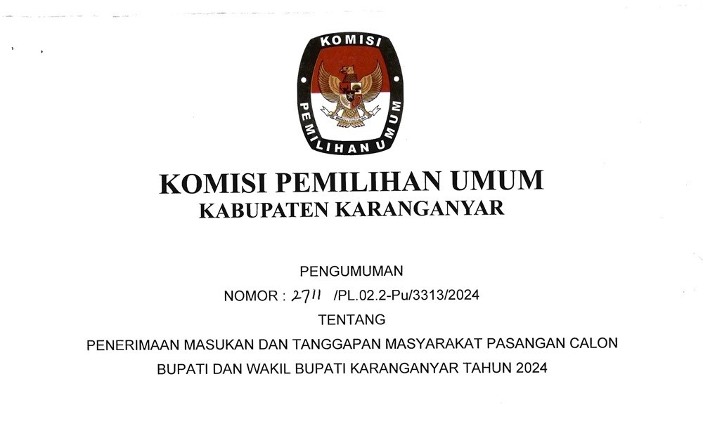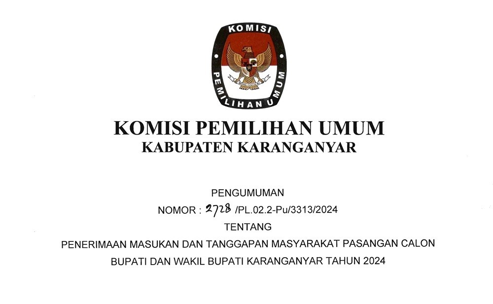 Pengumuman Tentang Penerimaan Masukan dan Tanggapan Masyarakat Pasangan Calon Bupati dan Wakil Bupati Karanganyar Tahun 2024 Minggu, 15 September 2024 14:00 184 DOWNLOAD PENGUMUMAN VISI DAN MISI PASLON ILYAS AKBAR ALMADANI - TRI HARYADI VISI DAN MISI PASLON ILYAS ROBER CHRISTANTO - ADHE ELIANA Baca Selengkapnya