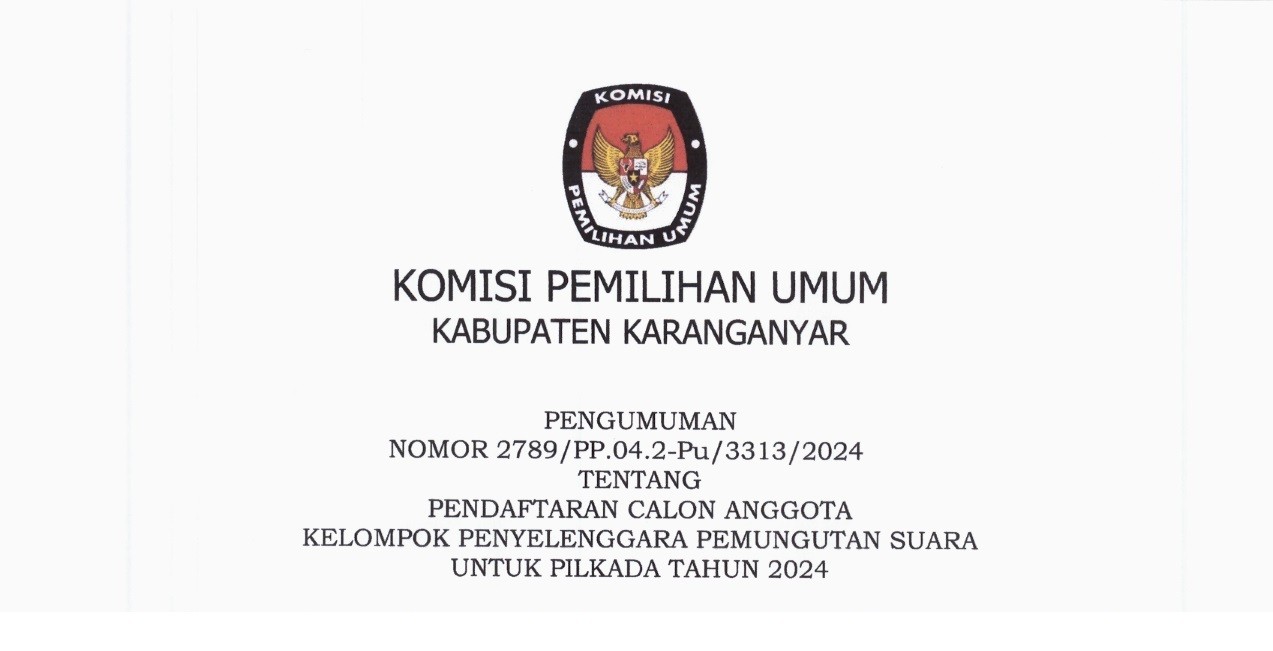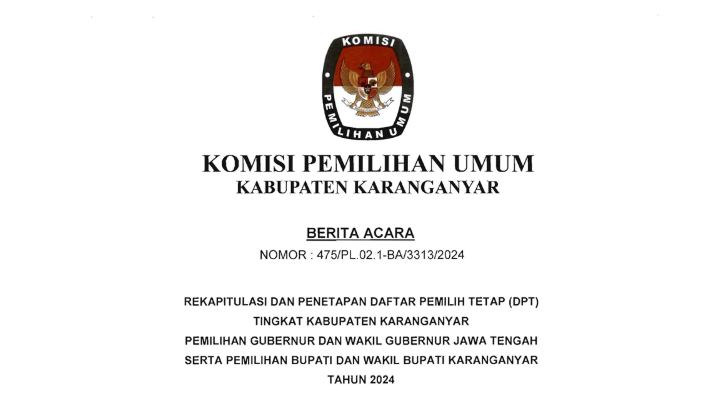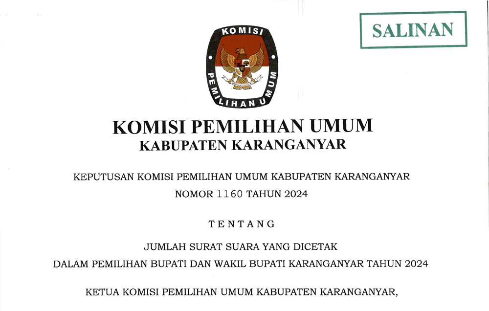 Keputusan KPU Kabupaten Karanganyar Nomor 1160 Tahun 2024 Tentang Jumlah Surat Suara yang Dicetak Dalam Pilbup Karanganyar 2024 Kamis, 19 September 2024 16:00 76 DOWNLOAD PENGUMUMAN Baca Selengkapnya