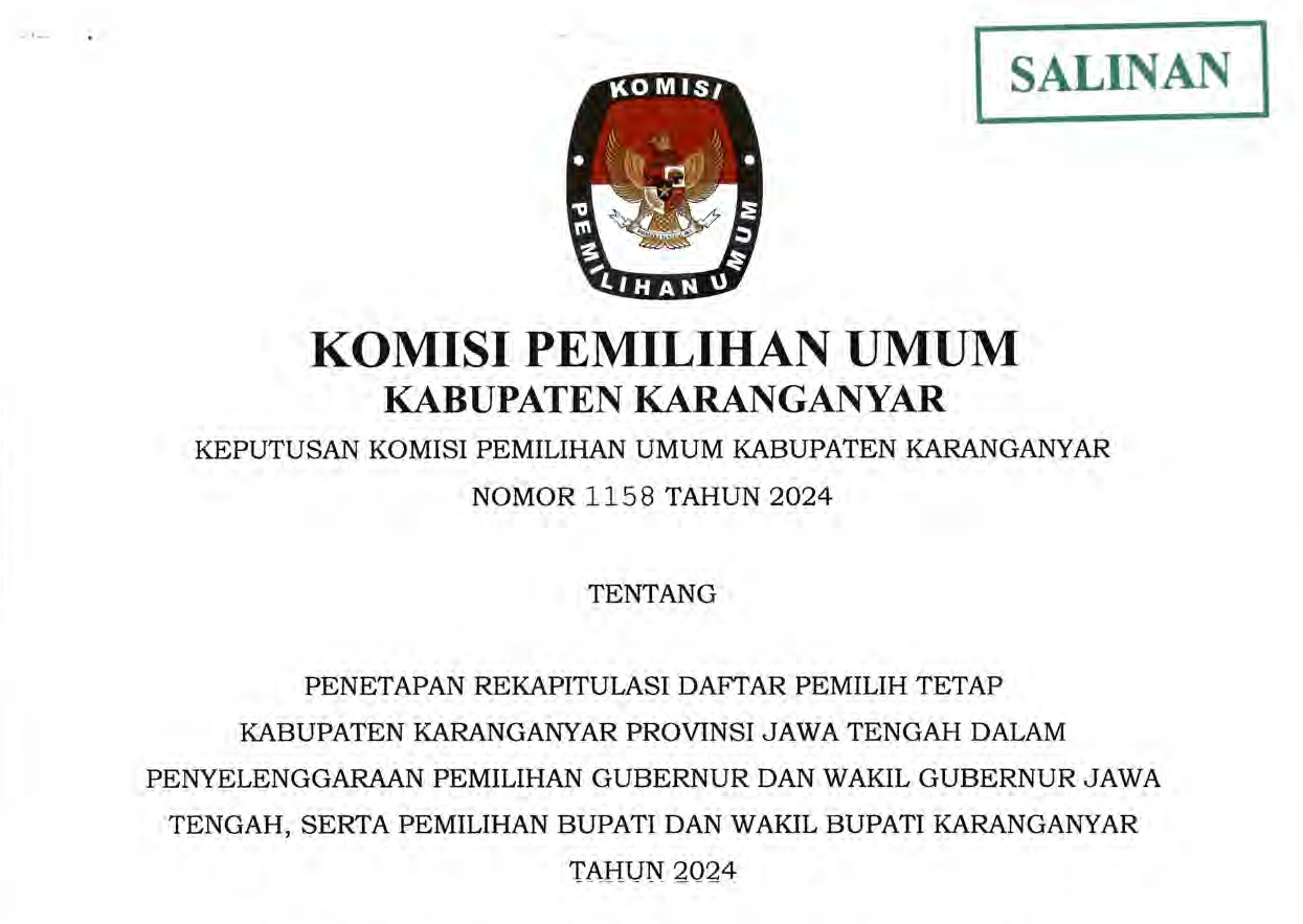 Keputusan KPU Kabupaten Karanganyar Nomor 1158 Tahun 2024 tentang Penetapan Rekapitulasi DPT Pilkada 2024 Rabu, 18 September 2024 16:00 DOWNLOAD KEPUTUSAN Baca Selengkapnya