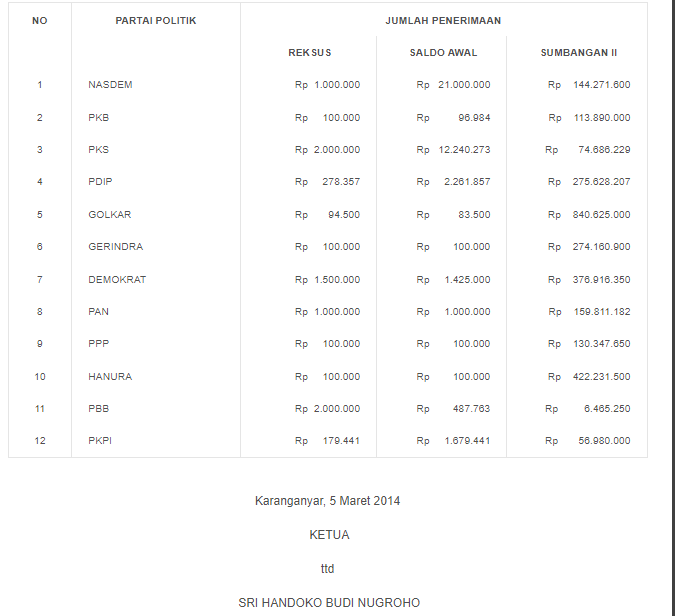PENGUMUMAN NOMOR : 2107/KPU-Kab-012.329506/XII/2013 TENTANG LAPORAN PENERIMAAN SUMBANGAN DANA KAMPANYE PARTAI POLITIK PESERTA PEMILUDPR, DPD DAN DPRD TAHUN 2014 PERIODE I ( TANGGAL 11 JANUARI S.D 27 DESEMBER 2013 ) KABUPATEN KARANGANYAR Berdasarkan Ketentuan Pasal 23 Ayat (3) Peraturan Komisi Pemilihan Umum Nomor 17 Tahun 2013 Tentang Pedoman Pelaporan Dana Kampanye Peserta Pemilihan Umum Anggota Dewan Perwakilan Rakyat, Dewan Perwakilan Daerah dan Dewan Perwakilan Rakyat Daerah, bersama ini kami umumkan Laporan Penerimaan Sumbangan Dana Kampanye Partai Politik Peserta Pemilu DPR, DPD dan DPRD Tahun 2014 Periode I (Tanggal 11 Januari s.d 27 Desember 2013) Kabupaten Karanganyar. Karanganyar, 30 Desember 2013 KETUA ttd SRI HANDOKO BUDI NUGROHO, ST Lampiran Pengumuman Penerimaan Sumbangan Dana Kampanye Periode I : 1. Partai Nasdem [download] 2. Partai Kebangkitan Bangsa (PKB) [download] 3. Partai Keadilan Sejahtera (PKS) [download] 4. Partai Demokrasi Indonesia Perjuangan (PDIP) [download] 5. Partai Golongan Karya (GOLKAR) [download] 6. Partai Gerakan Indonesia Raya (GERINDRA) [download] 7. Partai Demokrat [download] 8. Partai Amanat Nasional (PAN) [download] 9. Partai Persatuan Pembangunan (PPP) [download] 10. Partai Hati Nurani Rakyat (HANURA) [download] 11. Partai Bulan Bintang (PBB) [download] 12. Partai Keadilan dan Persatuan Indonesia (PKPI) [download]