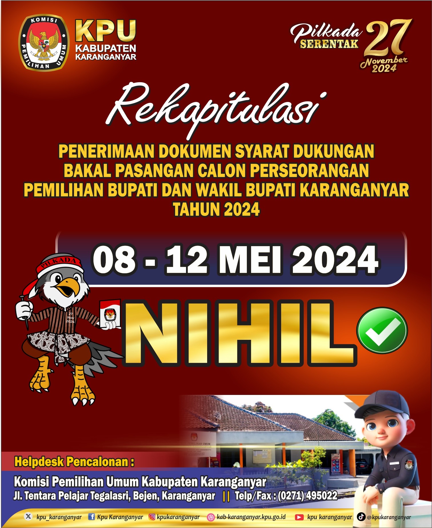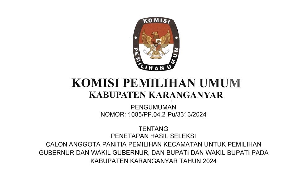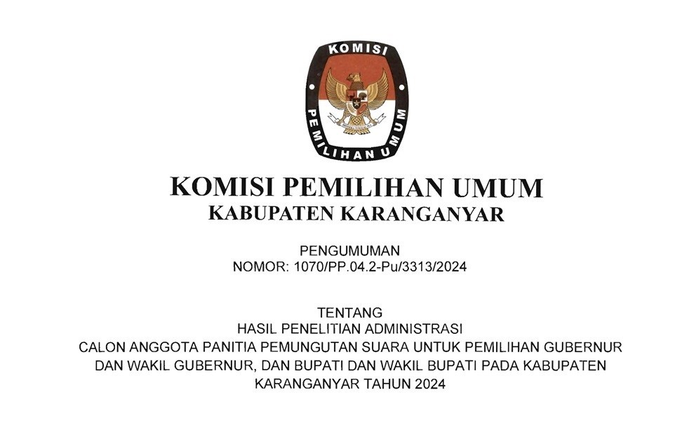 Press Release Nomor : 1068/ PL.02.2-Pu/ 3313/ 2024 tentang Penutupan Penyerahan Syarat Dukungan Bakal Calon Perseorangan dalam Pemilihan Bupati dan Wakil Bupati Karanganyar Tahun 2024.