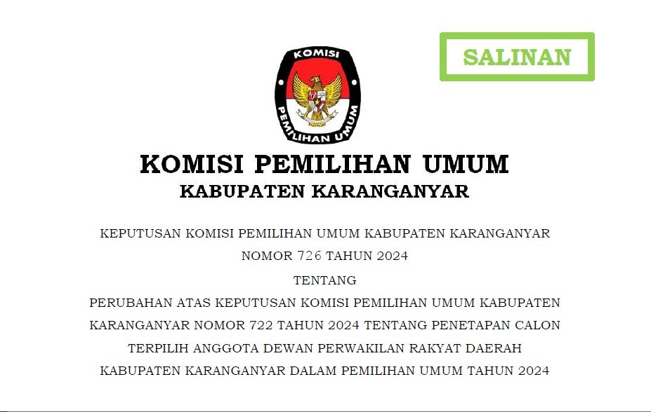 KEPUTUSAN KOMISI PEMILIHAN UMUM KABUPATEN KARANGANYAR NOMOR 726 TAHUN 2024 TENTANG PERUBAHAN ATAS KEPUTUSAN KOMISI PEMILIHAN UMUM KABUPATEN KARANGANYAR NOMOR 722 TAHUN 2024 TENTANG PENETAPAN CALON TERPILIH ANGGOTA DEWAN PERWAKILAN RAKYAT DAERAH KABUPATEN KARANGANYAR DALAM PEMILIHAN UMUM TAHUN 2024.