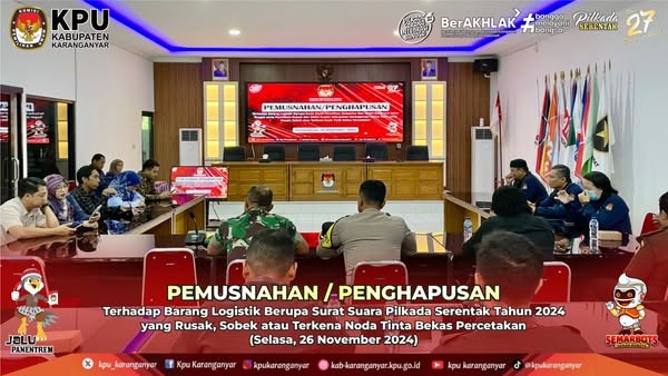 KPU Kabupaten Karanganyar Melaksanakan Pemusnahan/Penghapusan Terhadap Barang Logistik Berupa Surat Suara Pilkada Serentak Tahun 2024 yang Rusak, Sobek atau Terkena Noda Tinta Bekas Percetakan (Selasa, 26 November 2024)