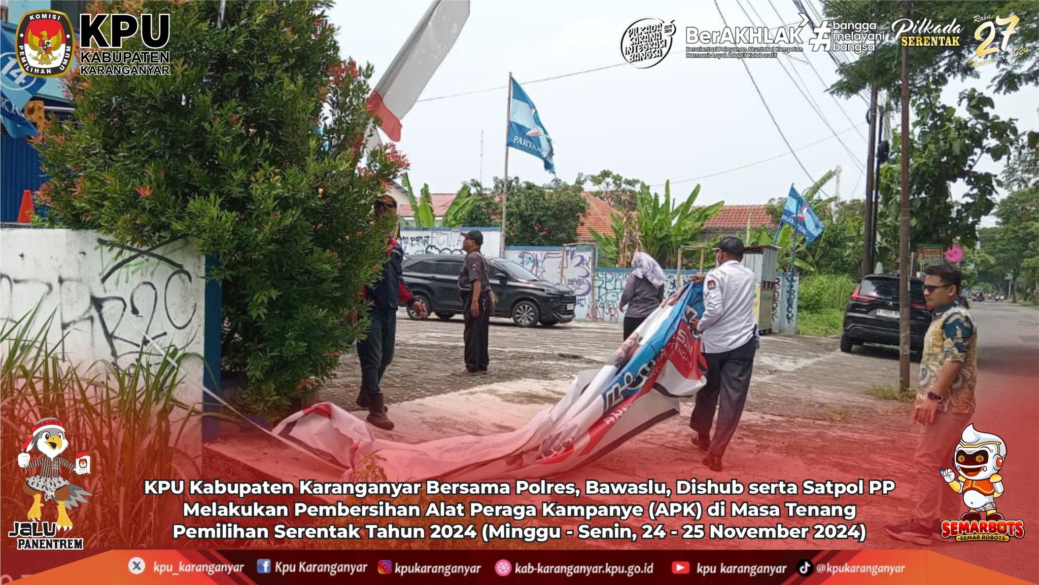 KPU Kabupaten Karanganyar Bersama Polres, Bawaslu, Dishub serta Satpol PP Melakukan Pembersihan Alat Peraga Kampanye (APK) di Masa tenang Pemilihan Serentak Tahun 2024 (Minggu - Senin, 24 - 25 November 2024)