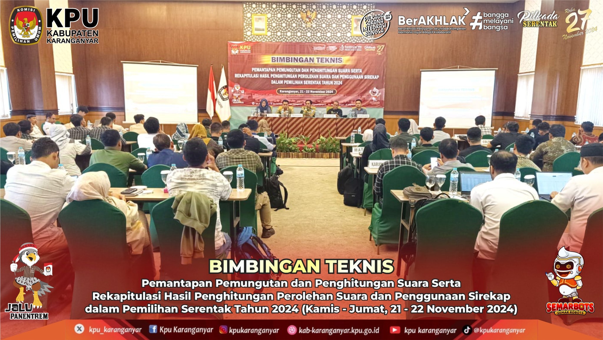 KPU Kabupaten Karanganyar Melaksanakan Bimbingan Teknis Pemantapan Pemungutan dan Penghitungan Suara Serta Rekapitulasi Hasil Penghitungan Perolehan Suara dan Penggunaan Sirekap dalam Pemilihan Serentak Tahun 2024 (Kamis - Jumat, 21 - 22 November 2024)