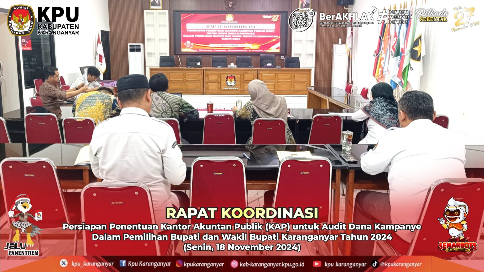 KPU Kabupaten Karanganyar Melaksanakan Rapat Koordinasi Persiapan Penentuan KAP untuk Audit Dana Kampanye dalam Pemilihan Bupati dan Wakil Bupati Karanganyar Tahun 2024 (Senin, 18 November 2024)