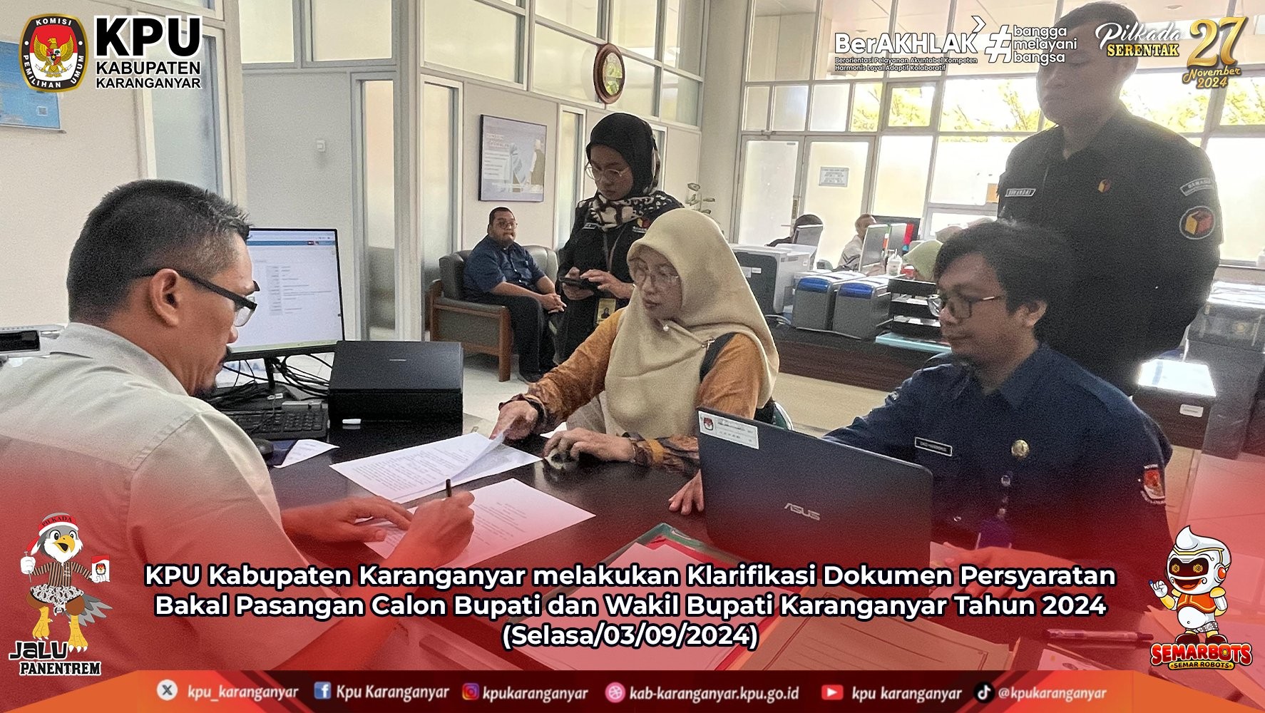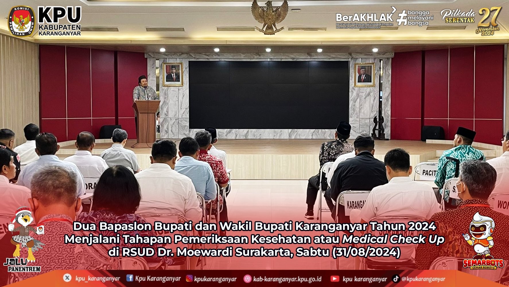 Selasa 3 September 2024, KPU Karanganyar gelar pembekalan Relawan Demokrasi Pemilihan Gubernur dan Wakil Gubernur Jawa Tengah serta Bupati dan Wakil Bupati Karanganyar Tahun 2024 di Pawon Ayu Resto Karanganyar. Sejumlah 25 Relawan Demokrasi dari 5 basis yaitu basis keagamaan, basis keluarga & komunitas, basis disabilitas dan kebutuhan khusus, basis perempuan, dan basis pemula/muda siap menyukseskan gelaran Pilkada 2024 dan tingkatkan angka partisipasi pemilih di Kab. Karanganyar