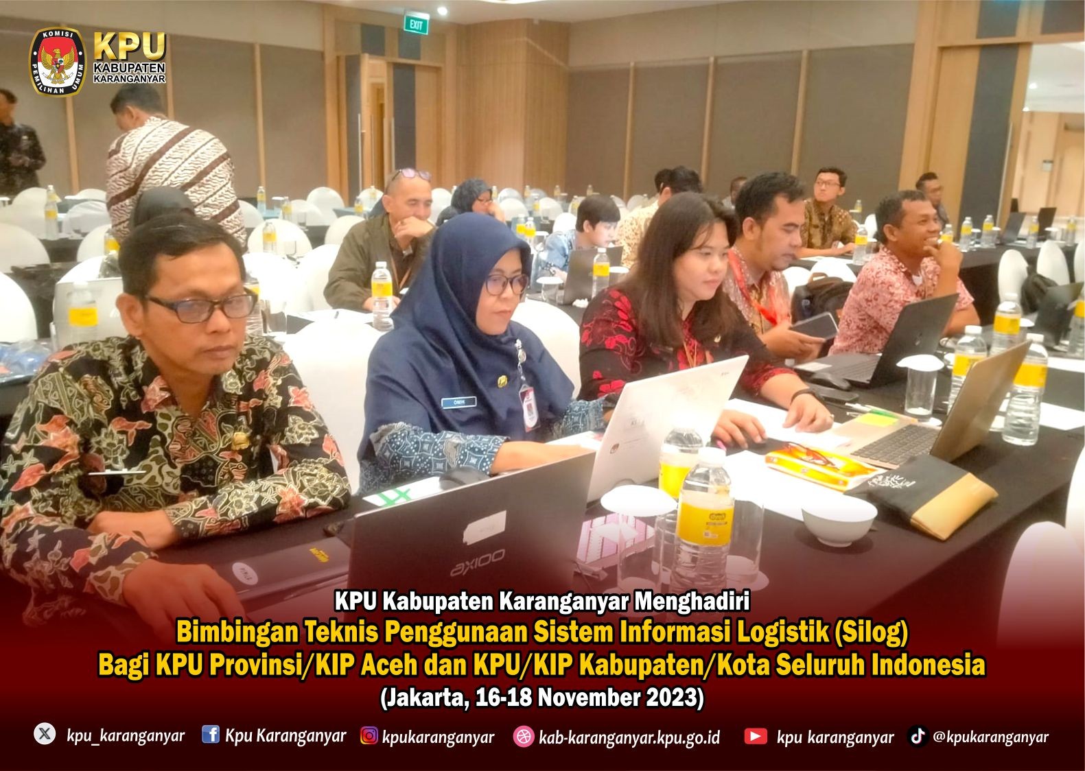 KPU Kabupaten Karanganyar menghadiri Bimbingan Teknis Penggunaan Sistem Informasi Logistik (Silog) Bagi KPU Provinsi/KIP Aceh dan KPU/KIP Kabupaten/Kota Seluruh Indonesia (Jakarta, 16-18 November 2023).