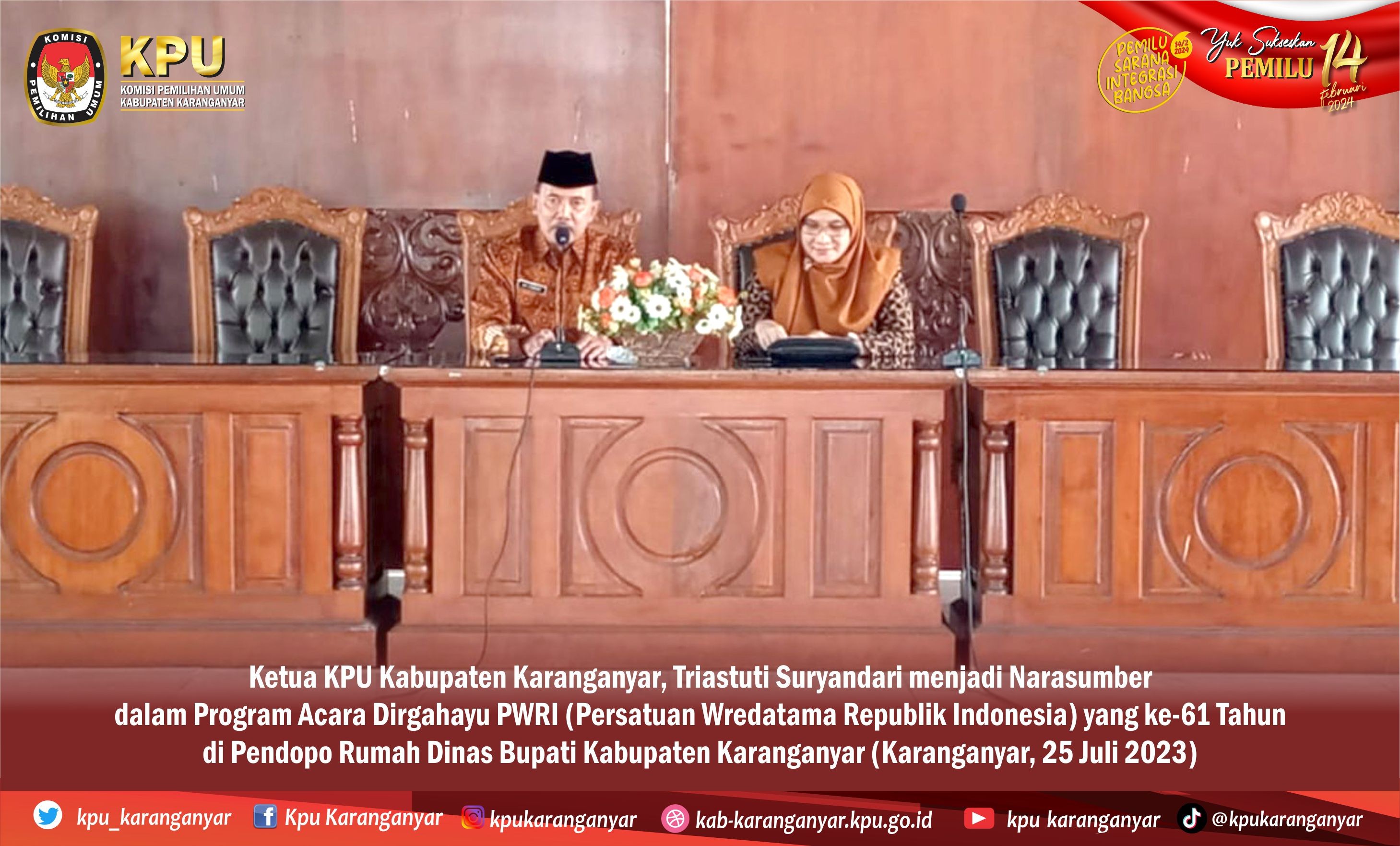 Ketua KPU Kabupaten Karanganyar, Triastuti Suryandari menjadi Narasumber dalam Program Acara Dirgahayu PWRI (Persatuan Wredatama Republik Indonesia) yang ke-61 Tahun di Pendopo Rumah Dinas Bupati Kabupaten Karanganyar pada Selasa (25/07/2023)