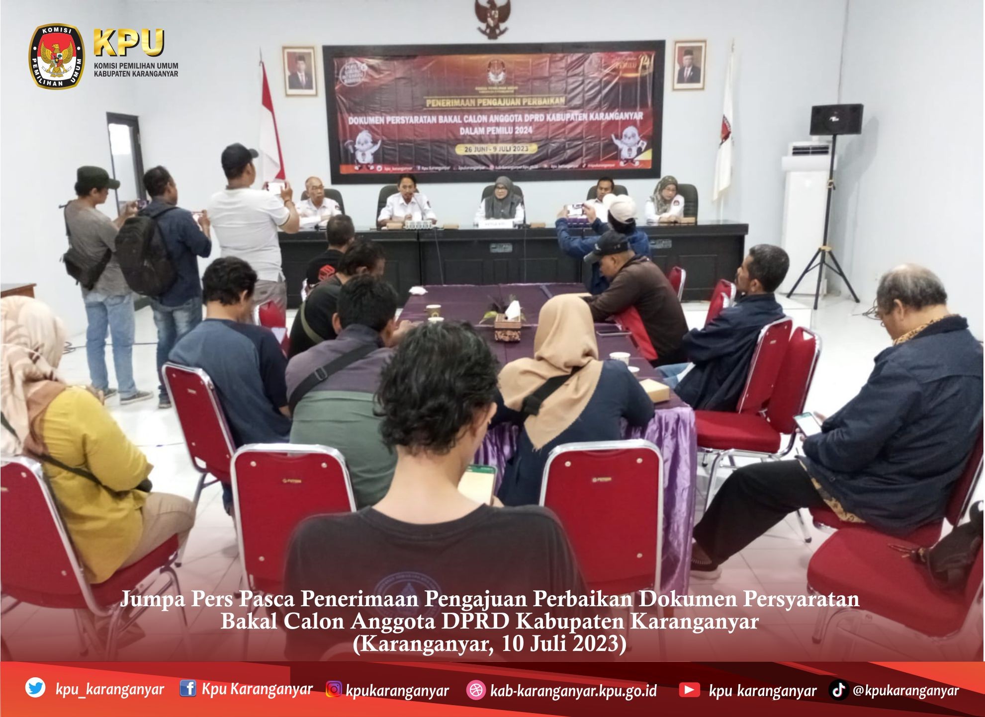 KPU Karanganyar Gelar Jumpa Pers Pasca Penerimaan Pengajuan Dokumen Perbaikan Bacaleg DPRD Kabupaten Karanganyar, Senin (10/7/2023).