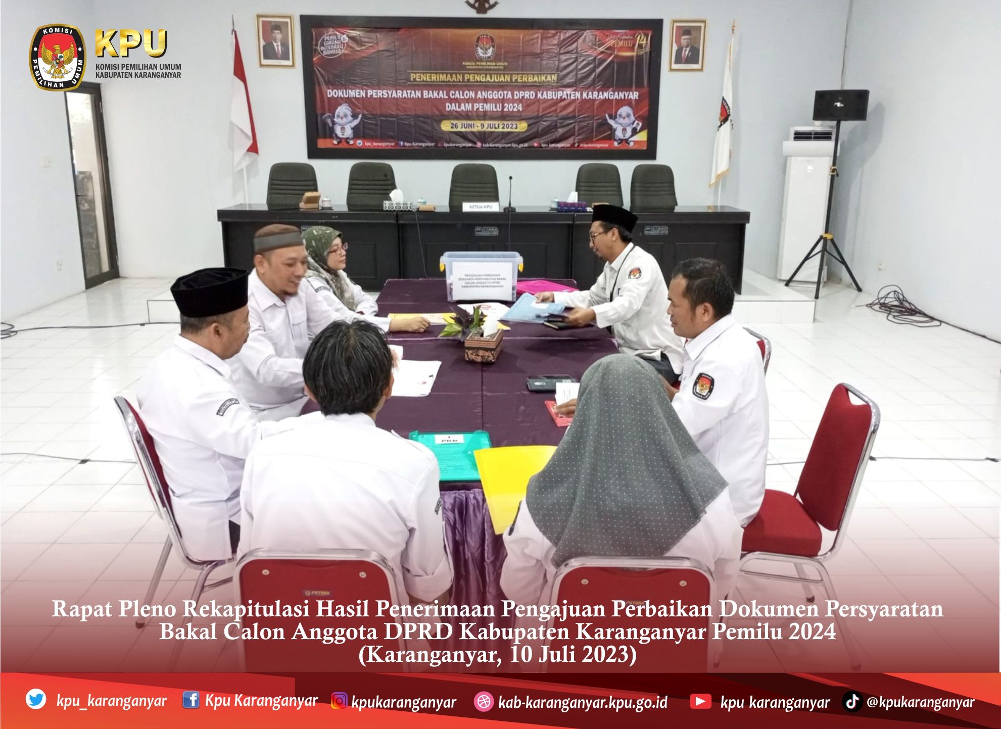 Tahapan penerimaan pengajuan perbaikan dokumen persyaratan bakal calon anggota legislatif (bacaleg) DPRD Karanganyar untuk Pemilu 2024 yang digelar KPU Karanganyar sejak tanggal 26 hingga 9 Juli 2023, telah terlaksana. Setelah tahapan tersebut, KPU Karanganyar melakukan rekapitulasi pengajuan bacaleg. Hasil keseluruhan, 18 Partai Politik (Parpol) status lengkap dan diterima dengan total 517 Bacaleg DPRD Karanganyar.