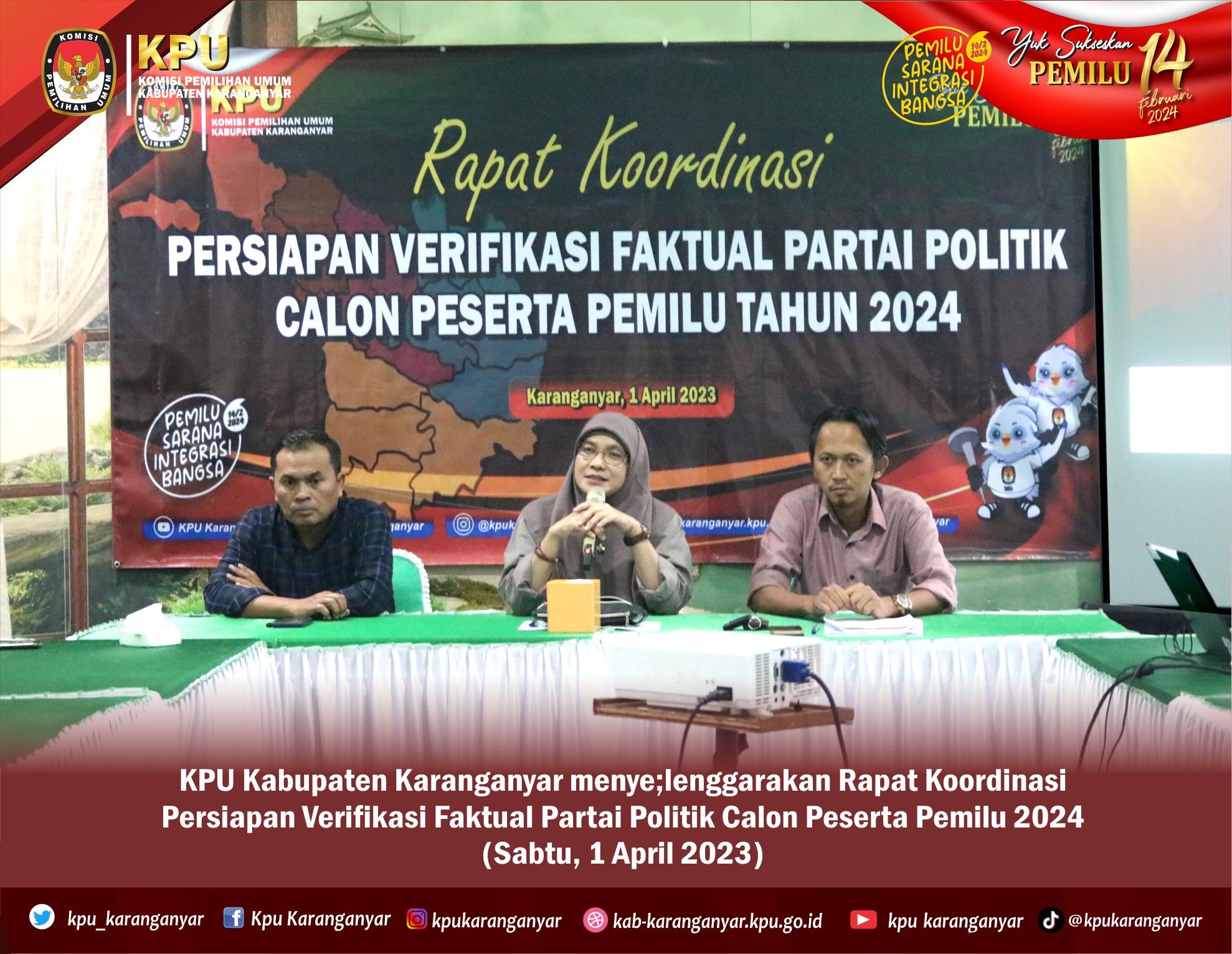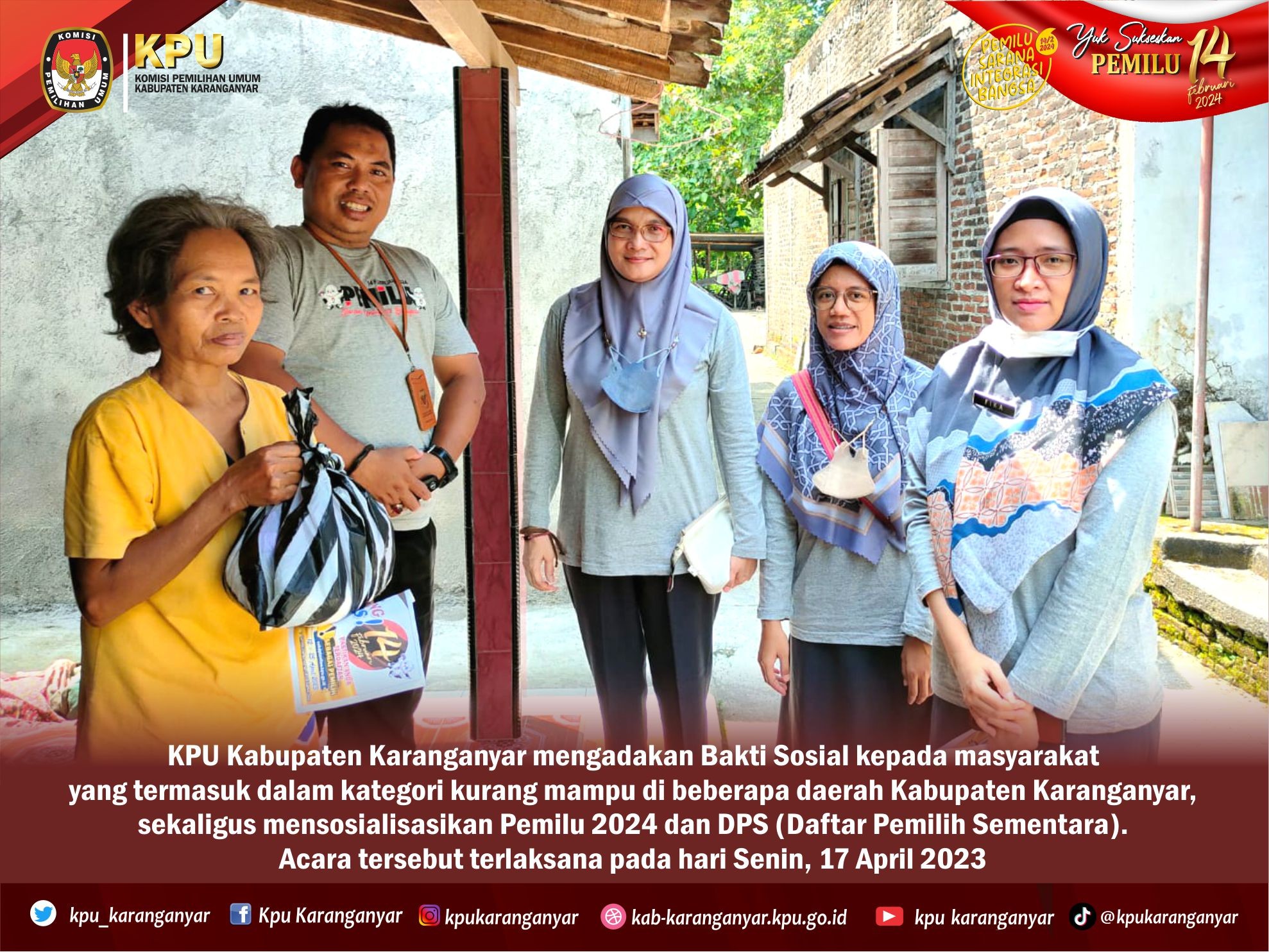 KPU Kabupaten Karanganyar mengadakan Kegiatan Bakti Sosial dan sekaligus Sosialisasi Pemilu 2024 kepada warga masyarakat Karanganyar. Kegiatan tersebut berkaitan dengan ajakan hari dan tanggal Pemilu, apa saja yang dipilih di Pemilu 2024 nanti, dan apakah warga sudah terdaftar di DPS. Acara tersebut terlaksana pada hari Senin, 17 April 2023.