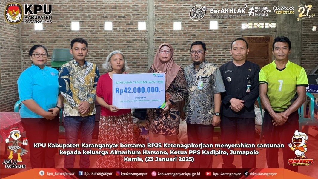 KPU Karanganyar-BPJS Ketenagakerjaan Serahkan Santunan Badan Adhoc Pilkada 2024 KARANGANYAR - Komisi Pemilihan Umum (KPU) Kabupaten Karanganyar bersama BPJS Ketenagakerjaan menyerahkan santunan kepada Badan Ad Hoc Penyelenggara Pilkada Serentak Tahun 2024 yang meninggal dunia, bertempat di kediaman keluarga Almarhum Harsono, Desa Kadipiro, Kecamatan Jumapolo, Kabupaten Karanganyar, Kamis (23/1/2025). Harsono merupakan Ketua PPS Desa Kadipiro yang meninggal dunia karena sakit pada 31 Desember 2024 lalu. Penyerahan santunan kepada keluarga/ahli waris dilakukan oleh anggota KPU Karanganyar Devid Wahyuningtyas dan Andis Yuli Pamungkas, mewakili Ketua KPU Kabupaten Karanganyar. Santunan yang diserahkan berupa santunan kematian dari BPJS Ketenagakerjaan sebesar Rp 42.000.000. Selain itu, karena almarhum juga merupakan kepala dusun/perangkat desa, juga mendapatkan santunan jaminan hari tua dan beasiswa Pendidikan putra-putri almarhum. Untuk beasiswa pendidikan diberikan setiap tahun sampai dengan putra-putri almarhum menyelesaikan kuliah. Untuk putra yang duduk di bangku SD mendapatkan santunan Rp 1.500.000 setiap tahun dan yang SMA mendapatkan Rp 3.000.000,- setiap tahunnya. Dalam sambutannya, Devid Wahyuningtyas mengucapkan turut berduka cita mendalam dan menyampaikan apresiasi atas dedikasi dan kerja keras almarhum yang telah ikut menjadi bagian dalam penyelenggaraan Pilkada Serentak Tahun 2024. "Kami KPU Karanganyar mengucapkan belangsungkawa dan dukacita yang mendalam kepada keluarga Bapak Harsono, dan sekaligus menyampaikan terimakasih atas dedikasinya dalam penyelenggara Pilkada Serentak Tahun 2024 di Kabupaten Karanganyar ," ucap Devid. “KPU memiliki komitmen besar dalam rangka melindungi kawan-kawan penyelenggara khususnya badan adhoc PPK, PPS, dan KPPS. Untuk itu, santunan ini diberikan KPU atas kerjasama dengan BPJS Ketenagakerjaan. Terima Kasih kepada BPJS Ketenagakerjaan sudah bekerja sama dengan KPU dalam rangka memberikan proteksi sehingga penyelenggara bisa bekerja dengan tenang, walaupun santunan ini tidak sebanding dengan musibah meninggalnya penyelenggara", ujarnya. Kepala BPJS Ketenagakerjaan Kabupaten Karanganyar, Uun Setyadi dalam sambutannya juga menyampaikan duka cita yang sedalam-dalamnya untuk keluarga Almarhum. “Kami mewakili manajemen mengucapkan duka cita sedalam-dalamnya, dan kami juga mengucapkan banyak terima kasih kepada KPU Kabupaten Karanganyar yang telah mengikutkan seluruh badan adhoc di Kabupaten Karanganyar dalam Progam BPJS Ketenagakerjaan. Selain itu, kami juga menyerahkan Jaminan Kecelakaan Kerja, Jaminan Hari Tua, Jaminan Pensiun Sebagai Perangkat Desa Kadipiro kepada Ahli Waris Bapak Harsono” terang Uun. Sementara itu, Pemerintah Kabupaten Karanganyar melalui Camat Jumapolo, Bambang Sriyanto juga menyampaikan duka cita dan apresiasi yang setinggi-tingginya kepada keluarga yang telah ditinggalkan. “Kami ucapkan terima kasih kepada KPU Kabupaten Karanganyar dan juga BPJS Kabupaten Karanganyar yang telah memberikan santunan kepada keluarga Bapak Harsono, semoga bermanfaat untuk membantu meringankan beban keluarga. Bapak Harsono juga merupakan Kepala Dusun Di Desa Kadipiro, Kecamatan Jumapolo,” ucap Bambang. (Qori).