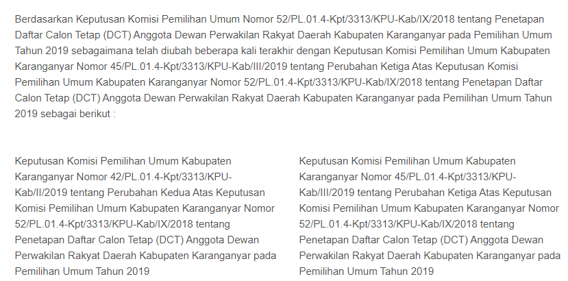 Berdasarkan Keputusan Komisi Pemilihan Umum Nomor 52/PL.01.4-Kpt/3313/KPU-Kab/IX/2018 tentang Penetapan Daftar Calon Tetap (DCT) Anggota Dewan Perwakilan Rakyat Daerah Kabupaten Karanganyar pada Pemilihan Umum Tahun 2019 sebagaimana telah diubah beberapa kali terakhir dengan Keputusan Komisi Pemilihan Umum Kabupaten Karanganyar Nomor 45/PL.01.4-Kpt/3313/KPU-Kab/III/2019 tentang Perubahan Ketiga Atas Keputusan Komisi Pemilihan Umum Kabupaten Karanganyar Nomor 52/PL.01.4-Kpt/3313/KPU-Kab/IX/2018 tentang Penetapan Daftar Calon Tetap (DCT) Anggota Dewan Perwakilan Rakyat Daerah Kabupaten Karanganyar pada Pemilihan Umum Tahun 2019 sebagai berikut : Keputusan Komisi Pemilihan Umum Kabupaten Karanganyar Nomor 42/PL.01.4-Kpt/3313/KPU-Kab/II/2019 tentang Perubahan Kedua Atas Keputusan Komisi Pemilihan Umum Kabupaten Karanganyar Nomor 52/PL.01.4-Kpt/3313/KPU-Kab/IX/2018 tentang Penetapan Daftar Calon Tetap (DCT) Anggota Dewan Perwakilan Rakyat Daerah Kabupaten Karanganyar pada Pemilihan Umum Tahun 2019 Download Keputusan Komisi Pemilihan Umum Kabupaten Karanganyar Nomor 45/PL.01.4-Kpt/3313/KPU-Kab/III/2019 tentang Perubahan Ketiga Atas Keputusan Komisi Pemilihan Umum Kabupaten Karanganyar Nomor 52/PL.01.4-Kpt/3313/KPU-Kab/IX/2018 tentang Penetapan Daftar Calon Tetap (DCT) Anggota Dewan Perwakilan Rakyat Daerah Kabupaten Karanganyar pada Pemilihan Umum Tahun 2019 Download Keputusan Komisi Pemilihan Umum Kabupaten Karanganyar Nomor 62/PL.01.4-Kpt/3313/KPU-Kab/XII/2018 tentang Perubahan Atas Keputusan Komisi Pemilihan Umum Kabupaten Karanganyar Nomor 52/PL.01.4-Kpt/3313/KPU-Kab/IX/2018 tentang Penetapan Daftar Calon Tetap (DCT) Anggota Dewan Perwakilan Rakyat Daerah Kabupaten Karanganyar pada Pemilihan Umum Tahun 2019 Download Keputusan Komisi Pemilihan Umum Kabupaten Karanganyar Nomor 52/PL.01.4-Kpt/3313/KPU-Kab/IX/2018 tentang Penetapan Daftar Calon Tetap (DCT) Anggota Dewan Perwakilan Rakyat Daerah Kabupaten Karanganyar pada Pemilihan Umum Tahun 2019 Download