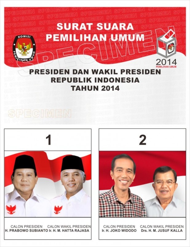 Specimen Surat Suara Pemilu Presiden dan Wakil Presiden 2014 Jumat, 20 Juni 2014 00:00 66 Specimen Surat Suara Pemilu Presiden dan Wakil Presiden 2014 Tampilan Dalam Lipatan Surat Suara Tampilan Luar Lipatan Surat Suara Baca Selengkapnya