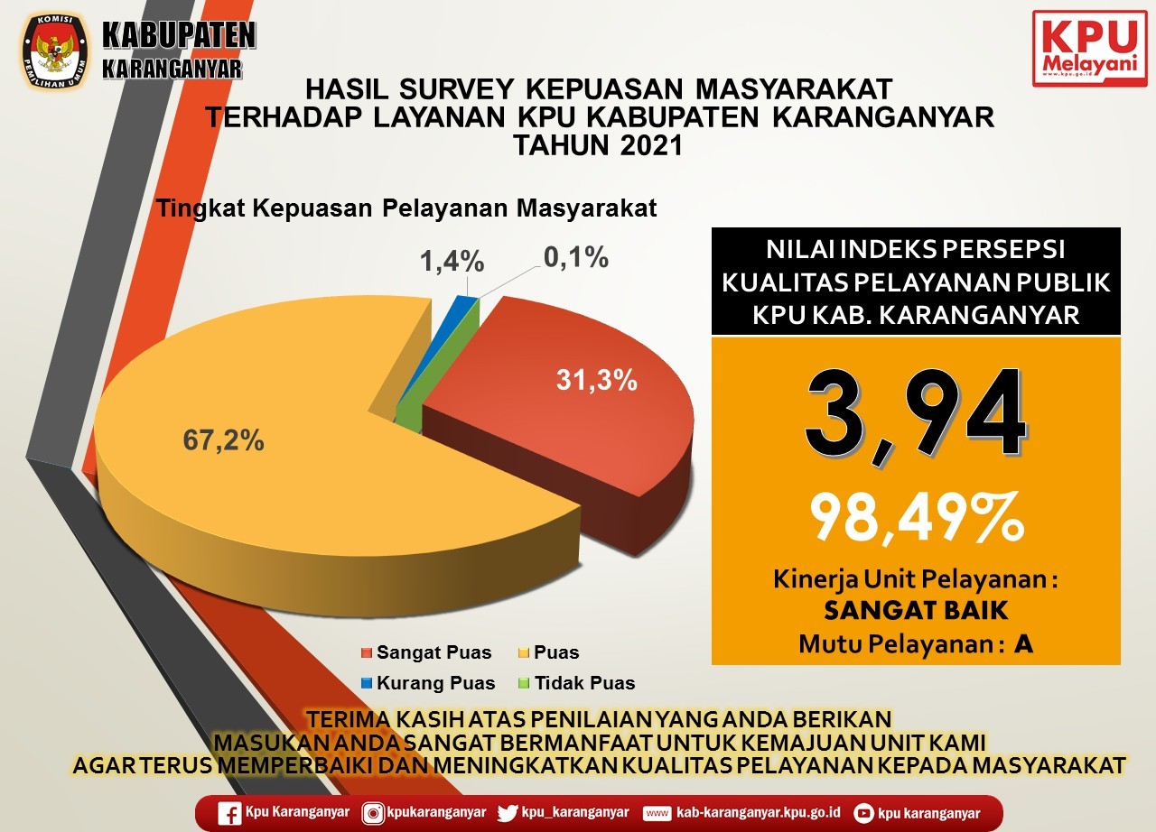 Hasil Survey Kepuasan Masyarakat Terhadap Layanan KPU Karanganyar Tahun 2021 Jumat, 01 April 2022 00:00 181 Hasil Survey Kepuasan Masyarakat Terhadap Layanan KPU Karanganyar Tahun 2021 Baca Selengkapnya