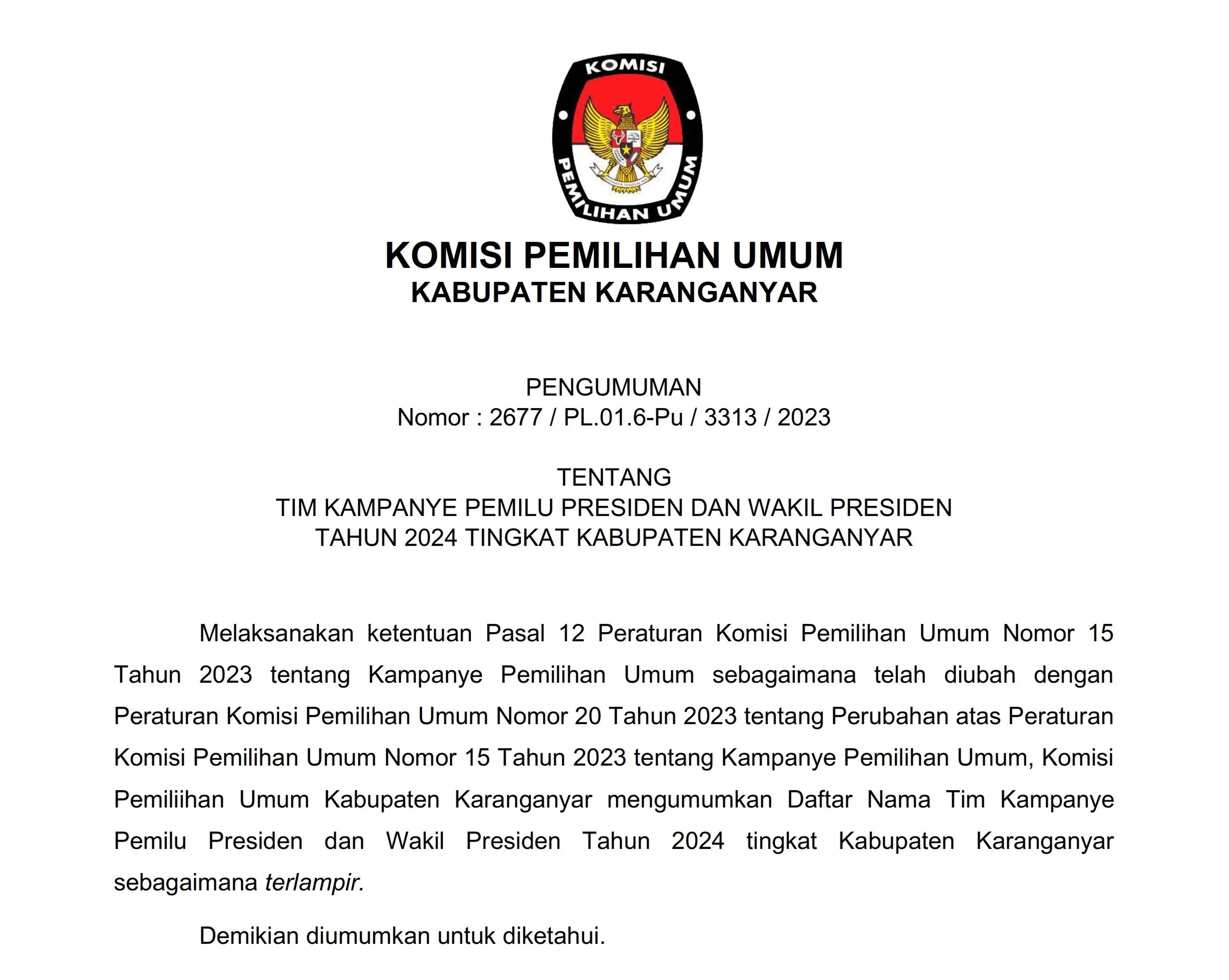 PENGUMUMAN TENTANG TIM KAMPANYE PEMILU PRESIDEN DAN WAKIL PRESIDEN TAHUN 2024 TINGKAT KABUPATEN KARANGANYAR Senin, 04 Desember 2023 14:00 Pengumuman selengkapnya Download Disini Baca Selengkapnya