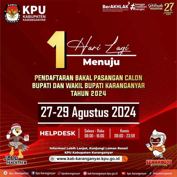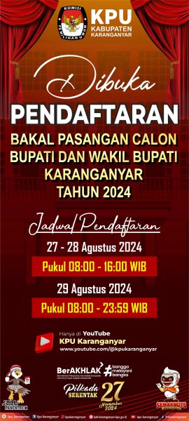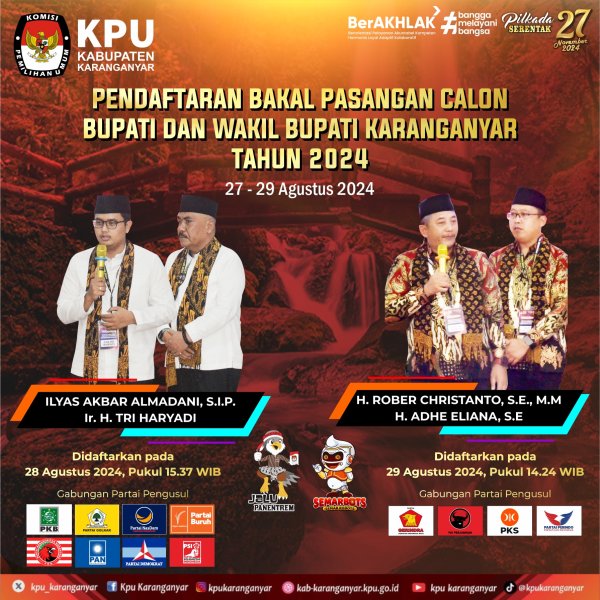 Berikut info bakal pasangan calon Bupati dan Wakil Bupati Karanganyar Tahun 2024.