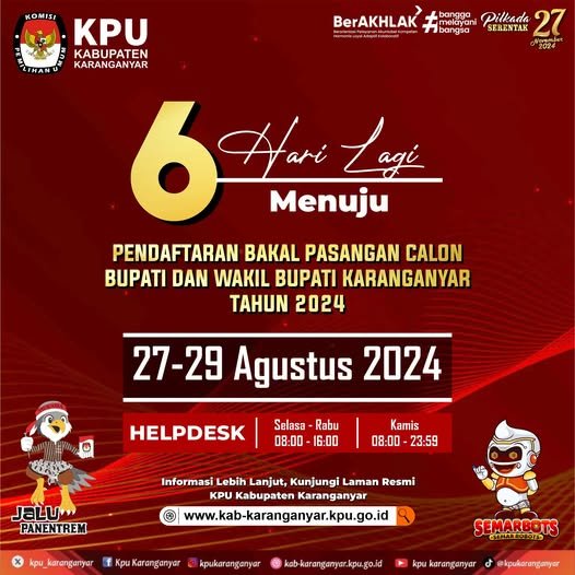 6 Hari lagi menuju Pendaftaran Bakal calon Bupati dan Wakil Bupati Karanganyar pada Pilkada 2024.
