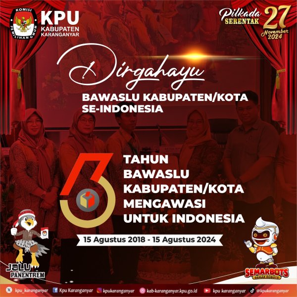 KPU Kabupaten Karnaganyar mengucapkan Dirgahayu Republik Indonesia ke-79 Mari turut serta wujudkan perubahan besar di negeri ini jadi perubahan terbaik. "Nusantara Baru, Indonesia Maju"