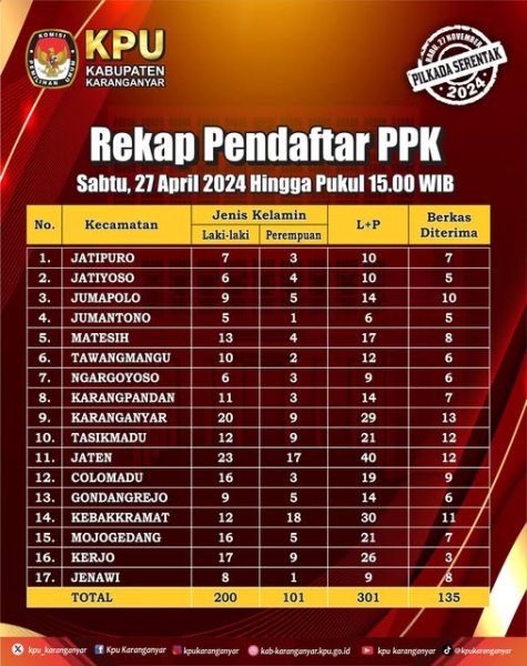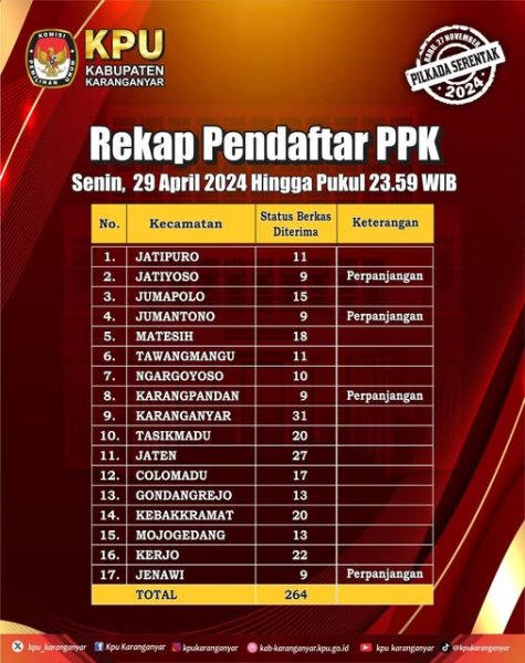 KPU Kabupaten Karanganyar memperpanjang Pendaftaran Badan Adhoc Panitia Pemilihan Kecamatan (PPK) Pilkada Serentak Tahun 2024 khusus bagi 4 Kecamatan yaitu :