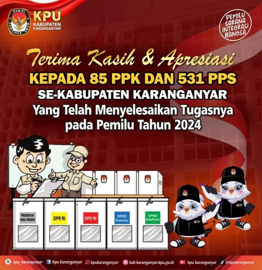 Terimakasih dan Apresiasi kepada 85 PPK dan 531 PPS se-Kabupaten Karanganyar yang telah menyelesaikan tugasnya pada Pemilu tahun 2024. Jumat, 05 April 2024 09:49 4 #KPUMelayani Baca Selengkapnya
