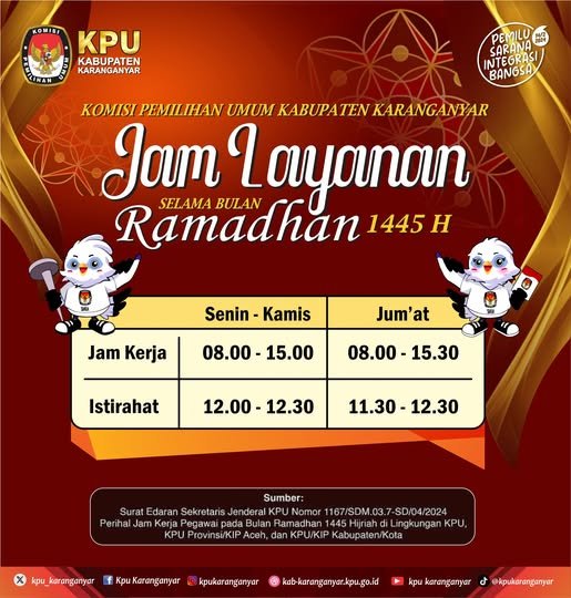 Selamat Menunaikan ibadah Puasa Ramadhan 1445 H. Selasa, 12 Maret 2024 10:27 4 KPU Kabupaten Karanganyar mengucapkan #kpumelayani #pemiluserentak2024 Baca Selengkapnya