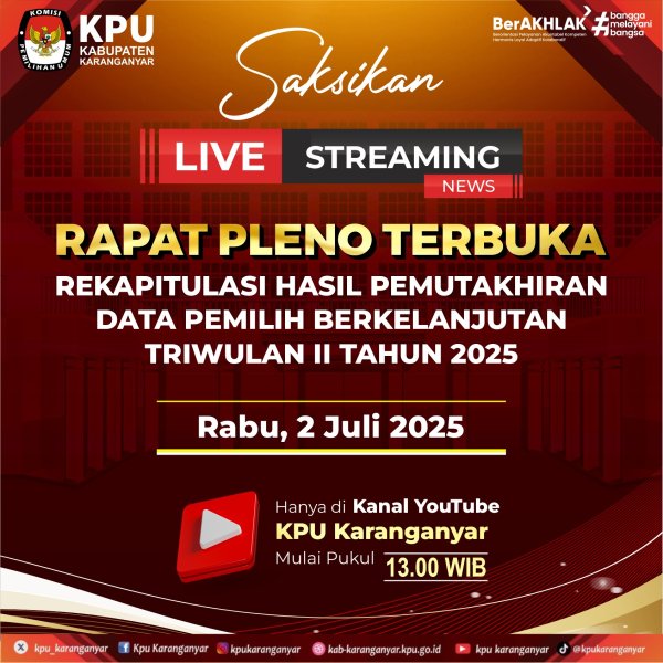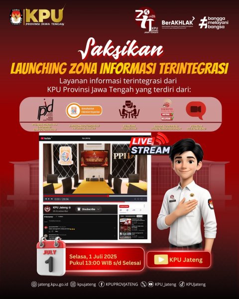 Jangan lupa saksikan Launching Zona Informasi Terintegrasi (ZIT) yang akan disiarkan secara langsung pada Selasa, 1 Juli 2025 pukul 13.00 WIB, hanya di channel Youtube KPU Jateng.