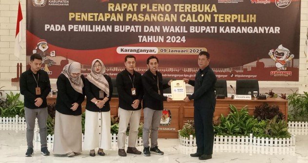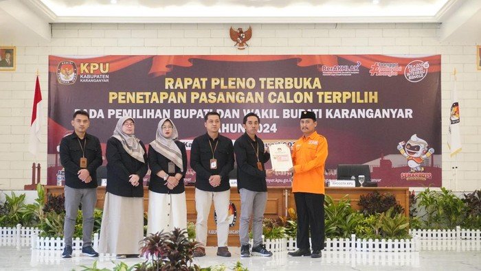 Karanganyar - KPU Karanganyar menggelar penetapan pasangan calon terpilih Pilkada Kabupaten Karanganyar 2024. Baik paslon terpilih maupun rivalnya di Pilkada Karanganyar 2024 tidak hadir.