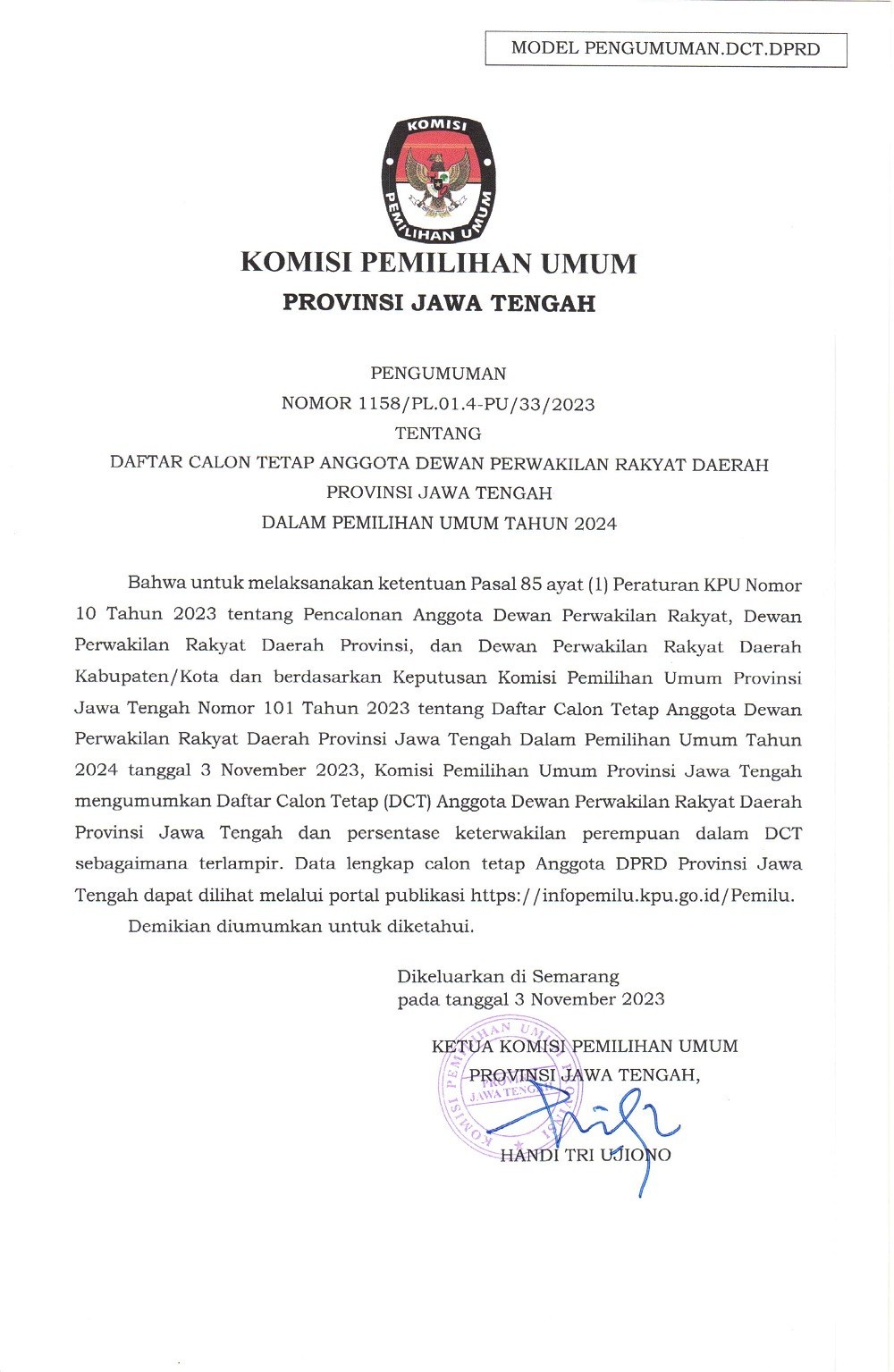 PENGUMUMAN TENTANG DAFTAR CALON TETAP ANGGOTA DEWAN PERWAKILAN RAKYAT DAERAH PROVINSI JAWA TENGAH DAPIL JAWA TENGAH 6